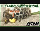 ハチの巣からハチの幼虫を強奪するアリの集団