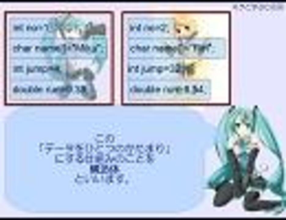 C言語の初学者のための講座です。<br />ミクと一緒に楽しく勉強しよう!<br />前作から約1年・・・ついに復活しました!お待たせしました><<br />講義内容:構造体(レコード、メンバ)、etc...<br />参考プログラムのダウンロード[pass:mikuc]:<a href="http://www1.axfc.net/uploader/File/so/42513.zip" target="_blank" rel="noopener nofollow">http://www1.axfc.net/uploader/File/so/42513.zip</a><br />マイリスト:<a href="https://www.nicovideo.jp/mylist/11224473" target="_blank" rel="noopener">mylist/11224473</a><br />第01回:<a href="https://www.nicovideo.jp/watch/nm6216304" class="watch">nm6216304</a><br />第20回:<a href="https://www.nicovideo.jp/watch/nm6996273" class="watch">nm6996273</a>←|→第22回:<a href="https://www.nicovideo.jp/watch/nm10608442" class="watch">nm10608442</a><br /><br />Special Thanks!!<br />PIC:<a href="https://commons.nicovideo.jp/works/nc2140" target="_blank" rel="noopener">nc2140</a>,<a href="http://piapro.jp/isounagi,http://piapro.jp/rayfedl,http://piapro.jp/manima,http://piapro.jp/pure2462" target="_blank" rel="noopener nofollow">http://piapro.jp/isounagi,http://piapro.jp/rayfedl,http://piapro.jp/manima,http://piapro.jp/pure2462</a><br />BGM:<a href="https://www.nicovideo.jp/watch/sm1274898" class="watch">sm1274898</a>,1264787550,<a href="https://www.nicovideo.jp/watch/sm6206647" class="watch">sm6206647</a>