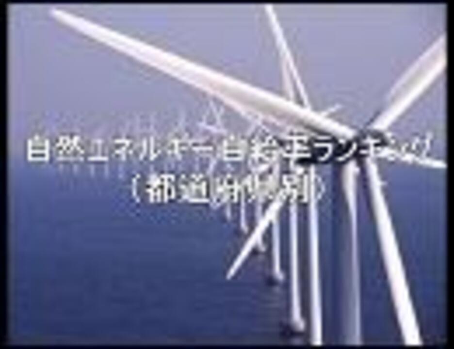 千葉大学公共研究センター/NPO法人環境エネルギー政策研究所が発表した<br />再生可能な自然エネルギーの自給率(H20)ランキング<br /><a href="http://sustainable-zone.org/" target="_blank" rel="noopener nofollow">http://sustainable-zone.org/</a><br /><br /><b>日本の自然エネルギー自給率は 「3.16%」</b><br /><br />自然エネルギーが豊富な都道府県はどこだ!?<br />※「自給率」ランキングであり人口が多くエネルギー需要の高い都道府県は下位になるため、<br /> 「供給量」のランクも参考として表示しています。<br /><br /><br /><font color="#33ff00"><b>第1弾<br />食料自給率ランキング(都道府県別)<a href="https://www.nicovideo.jp/watch/sm11630845" class="watch">sm11630845</a></b></font><br /><br /><br />お借りした音源<br />「夢想花」<a href="https://www.nicovideo.jp/watch/nm4228123" class="watch">nm4228123</a><br />「風になりたい」<a href="https://www.nicovideo.jp/watch/sm10965642" class="watch">sm10965642</a><br /><br /><br />火山や水資源の豊かな「日本」って素敵<br />風車もイイね(・∀・)