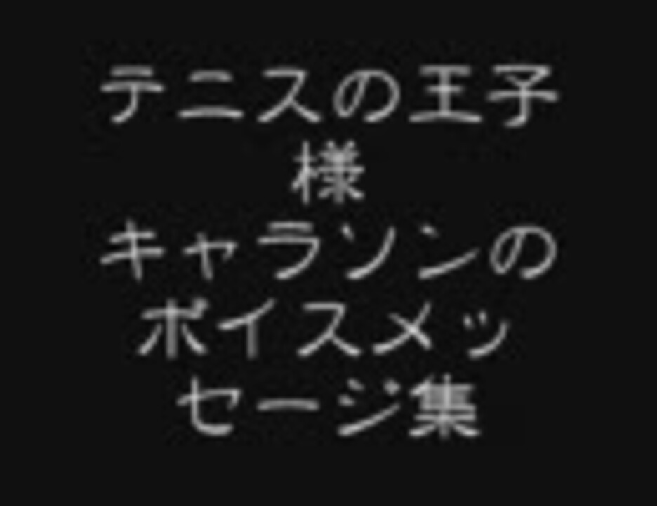 <font size="3">テニスの王子様の初期のキャラクターソングの声優さんのメッセージ集です。<br /></font><br />皆川純子(越前リョーマ)→置鮎龍太郎(手塚国光)→川本成(河村隆)→<br />津田健次郎(乾貞治)→甲斐田ゆき(不二周助)→喜安浩平(海堂薫)→<br />近藤孝行(大石秀一郎)→高橋広樹(菊丸英二)→小野坂昌也(桃城武)→<br />川原慶久(橘桔平)→森山栄治(伊武深司)→鈴木千尋(神尾アキラ)→<br />冨田真(不二裕太)→鶴岡聡(木更津淳)&森訓久(柳沢慎也)→<br />鳥海浩輔(千石清純)→小林由美子(壇太一)→佐々木望(亜久津仁)<br /><br />『ヒカルの碁』キャラクターソング ボイスメッセージ集⇒<a href="https://www.nicovideo.jp/watch/sm19941219" class="watch">sm19941219</a>
