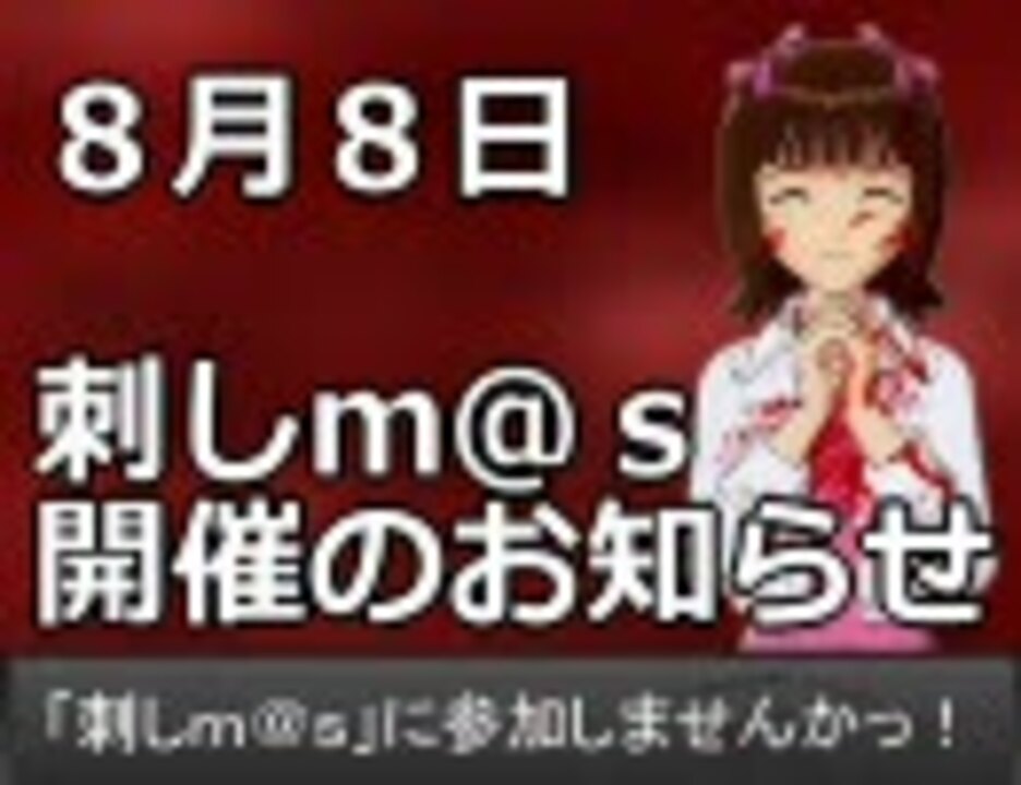 ギッスギスで殺伐としたアイマス界があってもいいじゃない!<br />Pが刺されたり、アイドルが刺しちゃったり、視聴者のハートをグサリと突き刺すようなそんな動画を投稿するお祭りの企画告知。<br />ヤンデレとか監禁とかそんな病的なベクトルも含めちゃいます!<br /> 開催日時 2010年8月8日<br /> 参加方法 動画を作って開催日に投稿したら「刺しm@s」タグをロックしましょう。<br /><br />詳細は刺しm@sコミュ(co308216)や刺しm@s広報ブログ(<a href="http://blog.livedoor.jp/sashimas/)を見てね!" target="_blank" rel="noopener nofollow">http://blog.livedoor.jp/sashimas/)を見てね!</a><br />主催:過労死P(<a href="https://www.nicovideo.jp/mylist/13840389" target="_blank" rel="noopener">mylist/13840389</a>) 刺しm@sマイリスト→<a href="https://www.nicovideo.jp/mylist/18548718" target="_blank" rel="noopener">mylist/18548718</a><br />そしてまさかのニアミス。一緒に盛り上げていこうぜ!→im@sミステリー祭り開催告知(<a href="https://www.nicovideo.jp/watch/sm10369785" class="watch">sm10369785</a>)<br /><br />【追記】開催直前告知動画をうpしました→<a href="https://www.nicovideo.jp/watch/sm11587637" class="watch">sm11587637</a>