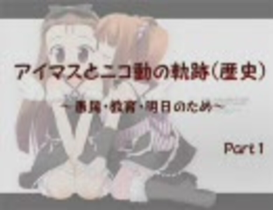 先日UPした動画〔<a href="https://www.nicovideo.jp/watch/sm991653" class="watch">sm991653</a>〕の修正版Part1です。<br /> コメントしていただいたことを参考に、色々と修正・追加しました。コメントでも歴史がさかのぼれるよう、当時のコメントや弾幕等思い思いにコメントしていただき、皆様の手で是非とも盛り上げていただければと思います♪<br />【追記】再生数が10k超え、大変多くの方に見ていただいたこと、マイリストに追加していただいたことに、感謝の気持ちでいっぱいです。また、週刊アイマスランキングへのタグリンクと除外ではありますが9月第3週19位、本当に本当に光栄です♪<br />Part1〔<a href="https://www.nicovideo.jp/watch/sm1056732" class="watch">sm1056732</a>〕 Part2〔<a href="https://www.nicovideo.jp/watch/sm1057038" class="watch">sm1057038</a>〕 Part1.2の番外編〔<a href="https://www.nicovideo.jp/watch/sm1078905" class="watch">sm1078905</a>〕 Part3〔<a href="https://www.nicovideo.jp/watch/sm1598181" class="watch">sm1598181</a>〕 Part3の番外編〔<a href="https://www.nicovideo.jp/watch/sm1715116" class="watch">sm1715116</a>〕 Part4〔<a href="https://www.nicovideo.jp/watch/sm1974378" class="watch">sm1974378</a>〕 作品リンク〔<a href="https://www.nicovideo.jp/mylist/2413364" target="_blank" rel="noopener">mylist/2413364</a>〕