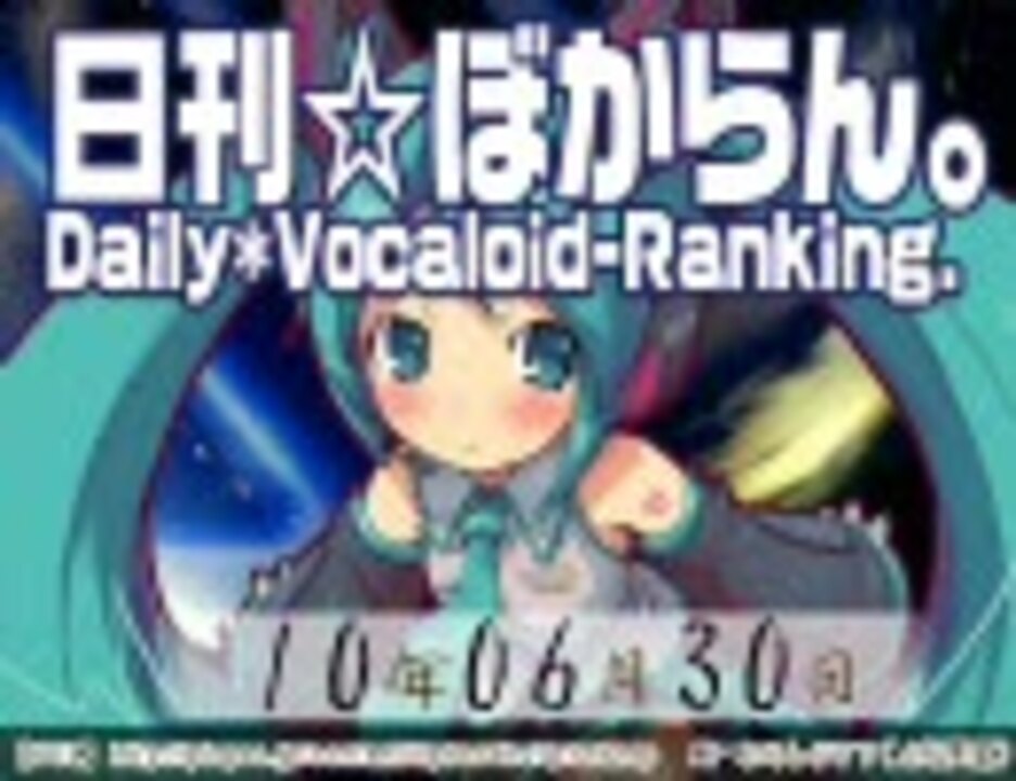 ・集計期間:~6月30日20時<br />・集計方法:再生数+コメント数×3+マイリスト数×15<br />(「コメント数×3」が再生数を超える場合、その分はカウントしません)<br />・集計対象:投稿日が1週間以内。<b>特定ワードがタイトルに含まれるか、タグロックされた動画</b><br />過去にランクインした動画は1位を除き対象外(1位は前日2~8位も対象)<br />詳しくは <a href="http://www.daily-vocaran.info" target="_blank" rel="noopener nofollow">http://www.daily-vocaran.info</a><br /><br />12 <a href="https://www.nicovideo.jp/watch/sm11179708" class="watch">sm11179708</a> 11 <a href="https://www.nicovideo.jp/watch/sm11172843" class="watch">sm11172843</a> 10 <a href="https://www.nicovideo.jp/watch/sm11198905" class="watch">sm11198905</a> 9 <a href="https://www.nicovideo.jp/watch/sm11169416" class="watch">sm11169416</a> <br />8 <a href="https://www.nicovideo.jp/watch/sm11202246" class="watch">sm11202246</a> 7 <a href="https://www.nicovideo.jp/watch/sm11196613" class="watch">sm11196613</a> 6 <a href="https://www.nicovideo.jp/watch/sm11209460" class="watch">sm11209460</a> 5 <a href="https://www.nicovideo.jp/watch/sm11231174" class="watch">sm11231174</a> <br />4 <a href="https://www.nicovideo.jp/watch/sm11210498" class="watch">sm11210498</a> 3 <a href="https://www.nicovideo.jp/watch/sm11215933" class="watch">sm11215933</a> 2 <a href="https://www.nicovideo.jp/watch/sm11178452" class="watch">sm11178452</a> 1 <a href="https://www.nicovideo.jp/watch/sm11209477" class="watch">sm11209477</a> <br />a <a href="https://www.nicovideo.jp/watch/sm7491054" class="watch">sm7491054</a> b <a href="https://www.nicovideo.jp/watch/sm11232587" class="watch">sm11232587</a> c <a href="https://www.nicovideo.jp/watch/sm11231070" class="watch">sm11231070</a> d <a href="https://www.nicovideo.jp/watch/sm11228429" class="watch">sm11228429</a> e <a href="https://www.nicovideo.jp/watch/sm11230740" class="watch">sm11230740</a> f <a href="https://www.nicovideo.jp/watch/sm11228026" class="watch">sm11228026</a> <br />g <a href="https://www.nicovideo.jp/watch/sm11229448" class="watch">sm11229448</a> h <a href="https://www.nicovideo.jp/watch/nm11187114" class="watch">nm11187114</a> i <a href="https://www.nicovideo.jp/watch/sm11206955" class="watch">sm11206955</a> <br /><br />日刊最新<a href="https://www.nicovideo.jp/mylist/5024496" target="_blank" rel="noopener">mylist/5024496</a> 全部<a href="https://www.nicovideo.jp/mylist/14684490" target="_blank" rel="noopener">mylist/14684490</a><br />6/29 <a href="https://www.nicovideo.jp/watch/sm11226457" class="watch">sm11226457</a> 7/1 <a href="https://www.nicovideo.jp/watch/sm11245080" class="watch">sm11245080</a><br />