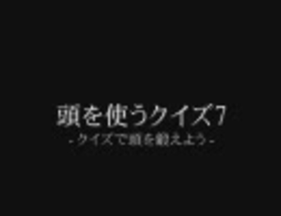 第7弾が完成しました。今までの作品頭を使うクイズ<a href="https://www.nicovideo.jp/watch/sm987191" class="watch">sm987191</a>頭を使うクイズ2<a href="https://www.nicovideo.jp/watch/sm989891" class="watch">sm989891</a>頭を使うクイズ3<a href="https://www.nicovideo.jp/watch/sm996664" class="watch">sm996664</a>頭を使うクイズ4<a href="https://www.nicovideo.jp/watch/sm1008048" class="watch">sm1008048</a>頭を使うクイズ5<a href="https://www.nicovideo.jp/watch/sm1020044" class="watch">sm1020044</a>頭を使うクイズ6<a href="https://www.nicovideo.jp/watch/sm1034320" class="watch">sm1034320</a>頭を使うクイズ8(最終回)<a href="https://www.nicovideo.jp/watch/sm1899328" class="watch">sm1899328</a>数学 ちょっと考えてしまう問題<a href="https://www.nicovideo.jp/watch/sm971095" class="watch">sm971095</a>解答<a href="https://www.nicovideo.jp/watch/sm971095" class="watch">sm971095</a>クイズ内容の募集のところで紹介されているteem.jpは、招待制に移行したため登録できません。