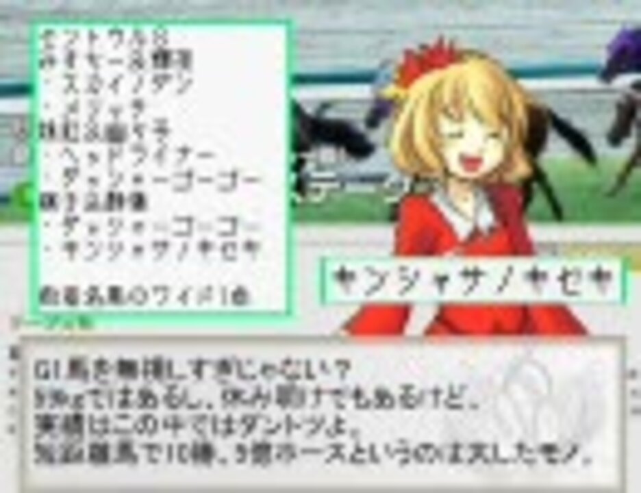 東方project他のキャラクターによる競馬予想の150回目。<br />詳細はタグ「WINS東方」の大百科をご参照ください。<br /><br />【みすちーママの熱唱コーナー】<br />あの馬想うと この胸騒ぐ♪<br />買いたい気持ちが ワクワクワクワク♪<br />ハズレを掴むと 体温上がる♪<br />悔しい気持ち ワナワナワナワナ♪<br /><br />●お世話になってます→<a href="http://ameblo.jp/iekai/" target="_blank" rel="noopener nofollow">http://ameblo.jp/iekai/</a><br />●屋台の裏にあるTwitter(更新情報等)→<a href="http://twitter.com/mariyatsu" target="_blank" rel="noopener nofollow">http://twitter.com/mariyatsu</a><br />●みすちー:安定感 輝夜:ひたすら穴党 妹紅:名前&良血<br /> 幽々子:適度に適度に 穣子:豊穣極まる若馬、上がり馬を買うべし 静葉:終わりを知らぬ老獪な馬、古き血を好んで<br /><br />WINS東方第151回→<a href="https://www.nicovideo.jp/watch/sm12143974" class="watch">sm12143974</a><br />マイリスト→<a href="https://www.nicovideo.jp/mylist/7463133" target="_blank" rel="noopener">mylist/7463133</a>