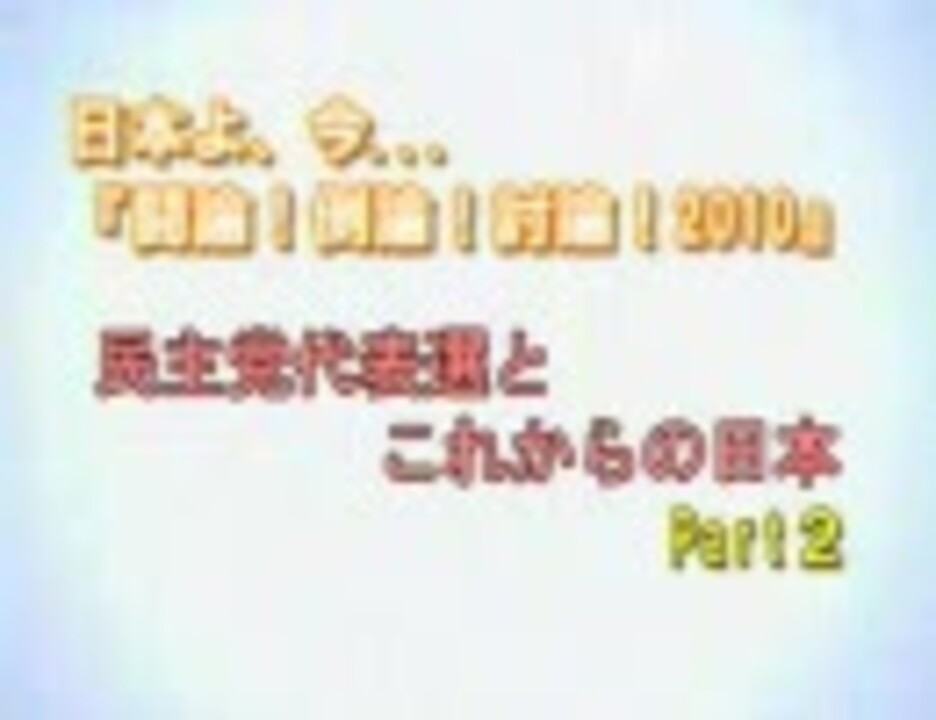 平成22年9月18日<br />日本文化チャンネル桜 日本よ、今...闘論!倒論!討論!2010【民主党代表選とこれからの日本Part2】<br />(YouTubeより動画連結)<br /><br />パネリスト:<br /> 宇田川敬介(国会新聞社編集次長・ジャーナリスト)<br /> 塚本三郎(元衆議院議員・元民社党委員長)<br /> 土屋たかゆき(東京都議会議員)<br /> 西尾幹二(評論家)<br /> 山田宏(日本創新党代表)<br /> 山村明義(ジャーナリスト)<br /> 山本峯章(政治評論家)<br />司会:水島総<br /><br />次 <a href="https://www.nicovideo.jp/watch/sm12152599" class="watch">sm12152599</a>(移動します)