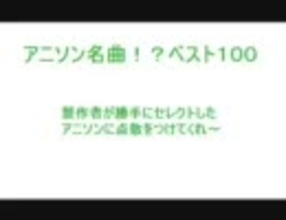 懐かしいアニソンから新しいアニソン100曲収録です。これはイイ!と来た曲のNoと採点(1~10)点をコメ欄につけてください。いつかランキング発表したいとおもいます