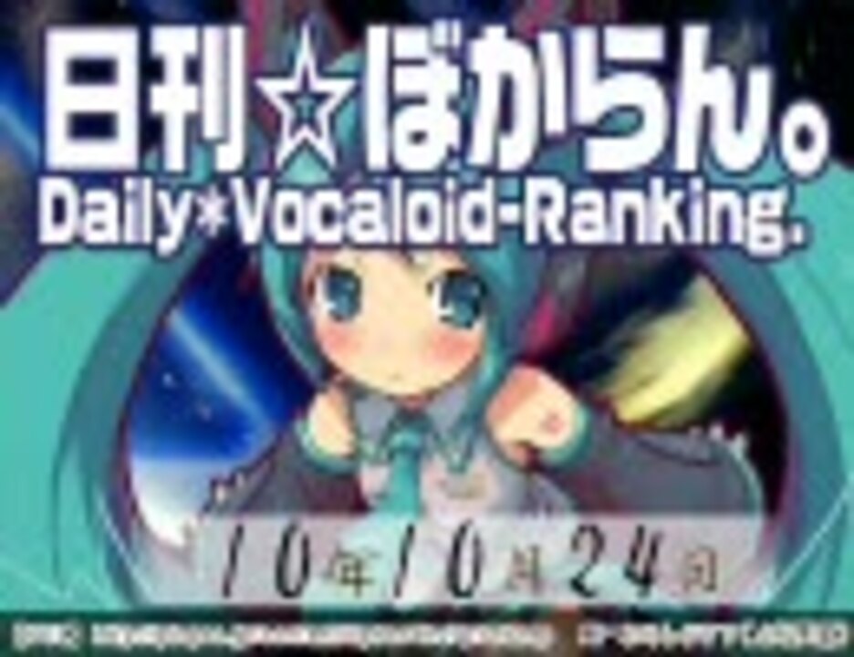 ・集計期間:~10月24日20時<br />・集計方法:再生数+コメント数×3+マイリスト数×15<br />(「コメント数×3」が再生数を超える場合、その分はカウントしません)<br />・集計対象:投稿日が1週間以内。<b>特定ワードがタイトルに含まれるか、タグロックされた動画</b><br />過去にランクインした動画は1位を除き対象外(1位は前日2~8位も対象)<br />詳しくは <a href="http://www.daily-vocaran.info" target="_blank" rel="noopener nofollow">http://www.daily-vocaran.info</a><br /><br />10 <a href="https://www.nicovideo.jp/watch/sm12526980" class="watch">sm12526980</a> 9 <a href="https://www.nicovideo.jp/watch/sm12492688" class="watch">sm12492688</a> 8 <a href="https://www.nicovideo.jp/watch/sm12477180" class="watch">sm12477180</a> 7 <a href="https://www.nicovideo.jp/watch/sm12511492" class="watch">sm12511492</a> <br />6 <a href="https://www.nicovideo.jp/watch/sm12521207" class="watch">sm12521207</a> 5 <a href="https://www.nicovideo.jp/watch/sm12516754" class="watch">sm12516754</a> 4 <a href="https://www.nicovideo.jp/watch/sm12526568" class="watch">sm12526568</a> 3 <a href="https://www.nicovideo.jp/watch/sm12524231" class="watch">sm12524231</a> <br />2 <a href="https://www.nicovideo.jp/watch/nm12521065" class="watch">nm12521065</a> 1 <a href="https://www.nicovideo.jp/watch/sm12517264" class="watch">sm12517264</a> <br />a <a href="https://www.nicovideo.jp/watch/sm8598971" class="watch">sm8598971</a> b <a href="https://www.nicovideo.jp/watch/sm12527577" class="watch">sm12527577</a> c <a href="https://www.nicovideo.jp/watch/sm12528968" class="watch">sm12528968</a> d <a href="https://www.nicovideo.jp/watch/sm12523743" class="watch">sm12523743</a> e <a href="https://www.nicovideo.jp/watch/sm12523438" class="watch">sm12523438</a> f <a href="https://www.nicovideo.jp/watch/sm12527072" class="watch">sm12527072</a> <br />g <a href="https://www.nicovideo.jp/watch/sm12523426" class="watch">sm12523426</a> h <a href="https://www.nicovideo.jp/watch/sm12526332" class="watch">sm12526332</a> i <a href="https://www.nicovideo.jp/watch/sm12525784" class="watch">sm12525784</a> j <a href="https://www.nicovideo.jp/watch/sm12524224" class="watch">sm12524224</a> k <a href="https://www.nicovideo.jp/watch/sm12468720" class="watch">sm12468720</a> l <a href="https://www.nicovideo.jp/watch/sm12511497" class="watch">sm12511497</a> <br /><br />日刊最新<a href="https://www.nicovideo.jp/mylist/5024496" target="_blank" rel="noopener">mylist/5024496</a> 全部<a href="https://www.nicovideo.jp/mylist/14684490" target="_blank" rel="noopener">mylist/14684490</a><br />10/23 <a href="https://www.nicovideo.jp/watch/sm12527922" class="watch">sm12527922</a> 10/25 <a href="https://www.nicovideo.jp/watch/sm12548548" class="watch">sm12548548</a><br />