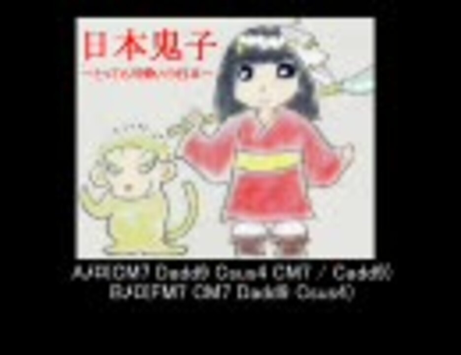 『日本鬼子 ~とっても可愛い小日本~』 作詞・作曲:まひる(2010/10/29)<br />こんにちは。日本鬼子。とっても可愛い小日本。<br />(你好。日本鬼子。非常可爱的小日本。)<br />Aメロ(CM7 Dadd9 Csus4 CM7 / Cadd9)Bメロ(FM7 CM7 Dadd9 Csus4)<br /><br />昨日⇒<a href="https://www.nicovideo.jp/watch/sm12574168" class="watch">sm12574168</a> 明日⇒『リーベングイズ(仮)』<a href="https://www.nicovideo.jp/watch/sm12637447" class="watch">sm12637447</a> マイリスト⇒<a href="https://www.nicovideo.jp/mylist/10772742" target="_blank" rel="noopener">mylist/10772742</a><br /><br />キー上げ、弾き語りのYouTube版<br /><a href="http://www.youtube.com/watch?v=mdUeudmlIsY" target="_blank" rel="noopener nofollow">http://www.youtube.com/watch?v=mdUeudmlIsY</a><br /><br />吉祥寺(外人さん多し)で、この曲をアンプ弾き語りしてみた。ちょっと声が震えた・・・