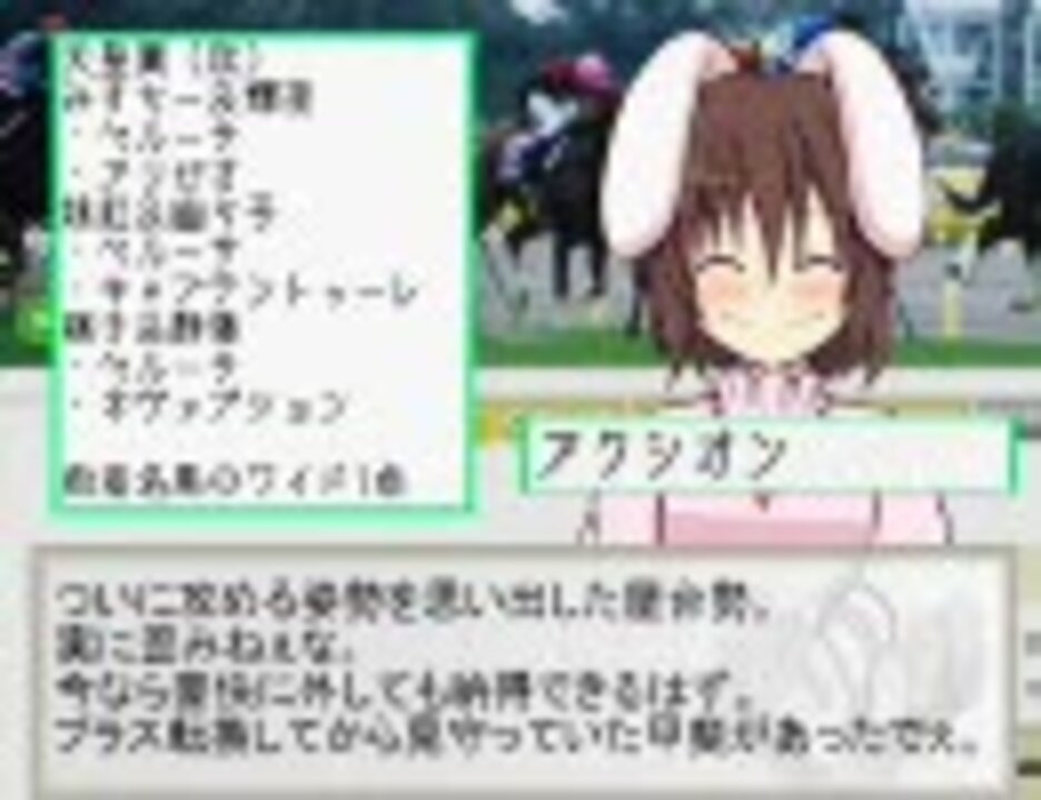 東方project他のキャラクターによる競馬予想の157回目。<br />詳細はタグ「WINS東方」の大百科をご参照ください。<br /><br />【みすちーママの熱唱コーナー】<br />行け! 疾風のごとく 孤高の天馬よ♪<br />時満つる朝に 金色になれ♪<br /><br />●お世話になってます→<a href="http://ameblo.jp/iekai/" target="_blank" rel="noopener nofollow">http://ameblo.jp/iekai/</a><br />●屋台の裏にあるTwitter(更新情報等)→<a href="http://twitter.com/mariyatsu" target="_blank" rel="noopener nofollow">http://twitter.com/mariyatsu</a><br />●みすちー:安定感 輝夜:ひたすら穴党 妹紅:名前&良血<br /> 幽々子:適度に適度に 穣子:豊穣極まる若馬、上がり馬を買うべし 静葉:終わりを知らぬ老獪な馬、古き血を好んで<br /><br />WINS東方第158回→<a href="https://www.nicovideo.jp/watch/sm12659933" class="watch">sm12659933</a><br />マイリスト→<a href="https://www.nicovideo.jp/mylist/7463133" target="_blank" rel="noopener">mylist/7463133</a><br />他製作物(プロフィール情報をご参照ください)→<a href="https://www.nicovideo.jp/user/991196" target="_blank" rel="noopener">user/991196</a>
