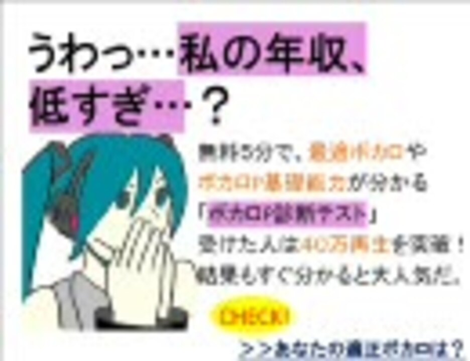 ほぼ日Pです。<br />例のイラッとくる広告にインスパイアされました。<br />やはり弟や妹より収入が低いと実家から足が遠のくものです。<br />カラオケは替え歌ウェルカムです <a href="http://piapro.jp/content/2nh3k6acxpl2t0y8" target="_blank" rel="noopener nofollow">http://piapro.jp/content/2nh3k6acxpl2t0y8</a><br />他の曲は→ <マイリスト> <a href="https://www.nicovideo.jp/mylist/12059661" target="_blank" rel="noopener">mylist/12059661</a><br /><まとめサイト><a href="http://d.hatena.ne.jp/niconicomania/" target="_blank" rel="noopener nofollow">http://d.hatena.ne.jp/niconicomania/</a><br />(この曲で233曲目)ピアプロもこちらから