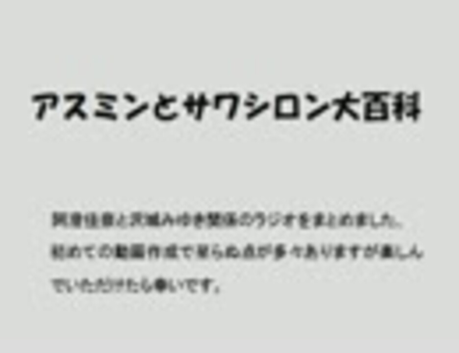 ひだまりラジオ×365~ひだまりラジオ×☆☆☆までの阿澄佳奈vs沢城みゆきの部分を抽出しました。時系列に並べてあるので二人の仲が良くなる過程を堪能できます.沢城さんが最近のラジオでフリーダムなのは、アスミスの影響だと思うのはうp主だけですか? <うp主が聞きたいラジオ> 「原作者萌えラジオin絶望放送」パーソナリティー:神谷・新谷 ゲスト:羽海野チカ・蒼樹うめ 「新workingラジオ」パーソナリティー:阿澄・喜多村 ゲスト:神谷 新作 阿澄佳奈と神谷浩史 大百科<a href="https://www.nicovideo.jp/watch/sm13055561" class="watch">sm13055561</a>
