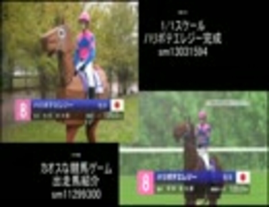 1/1スケール ハリボテエレジー完成 <a href="https://www.nicovideo.jp/watch/sm13031594" class="watch">sm13031594</a> と<br />カオスな競馬ゲーム 出走馬紹介 <a href="https://www.nicovideo.jp/watch/sm11299300" class="watch">sm11299300</a> その8 <a href="https://www.nicovideo.jp/watch/sm11317620" class="watch">sm11317620</a><br />との比較動画です。<br />アス比選択ミスりました<br /><br />