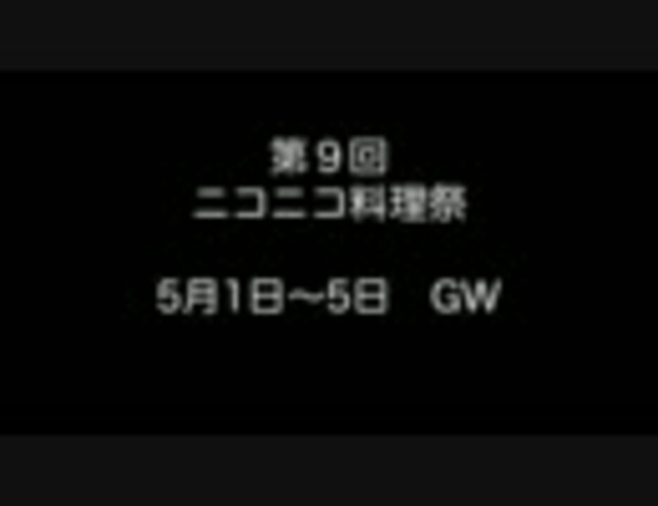 <font size="6" color="red">第9回ニコニコ料理祭告知動画です</font><br /><font size="3" color="blue">開催期間は平成23年5月1日(日)から5日(木)の5日間</font>です<br />皆様のご参加心よりお待ちしております!<br /><br />ニコニコ料理祭とは? → テーマ食材に沿った料理動画を投稿するイベントです。<br />■ニコニコ動画料理カテ@wiki:前回までの情報、料理カテに関してはこちら → <a href="http://www5.atwiki.jp/niconico_cookingtag/" target="_blank" rel="noopener nofollow">http://www5.atwiki.jp/niconico_cookingtag/</a><br />■したらば料理祭スレ:<b><font color="red">不明点、疑問点</font></b>などはこちらまでどうぞ →<a href="http://jbbs.livedoor.jp/bbs/read.cgi/internet/93/1280723227/" target="_blank" rel="noopener nofollow">http://jbbs.livedoor.jp/bbs/read.cgi/internet/93/1280723227/</a><br />■料理祭コミュニティ:お気軽にご参加ください → ニコニコ料理祭の素【co4974】<br />まとめ動画1日目【<a href="https://www.nicovideo.jp/watch/sm14427273" class="watch">sm14427273</a>】