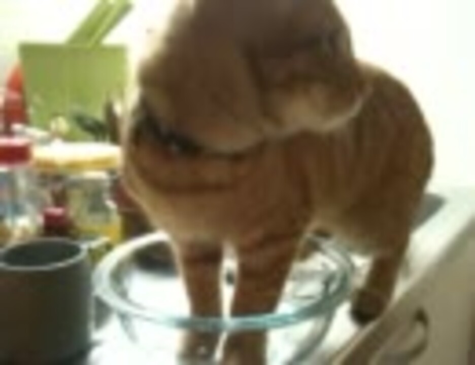 なんだその動きは <br /><br /><b>※5/13追記</b><br />コメントありがとうございます&台所汚くてすんませんwww<br />ボウルは特にエサ用じゃなくて、普段料理にも使ってるやつで洗ったばっかりです。<br />多分キュッキュッとすべるのが楽しいんですかねぇ…。
