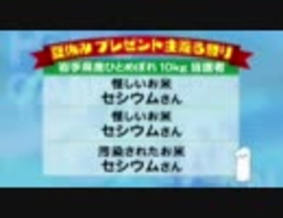 東海テレビ(フジテレビ系列)「ぴーかんテレビ」というローカル番組で<br />お米が貰えるプレゼントを企画<br /> ↓ <br />番組中の通販コーナーで商品説明のテロップを出し間違いで上記の<br />プレゼントの当選者が20秒ほどテロップで流れる <br /> ↓ <br />しかしそのテロップが大問題
