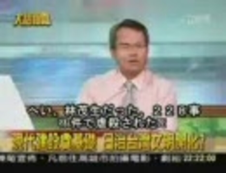 これは台湾の人気政論番組「大話新聞」(Talking Show)が土曜と日曜で放送するスペシャル番組です。そしてこの番組は世間話で専門書を紹介しながら日本時代を検証するので、多少凄いつっこみが出てきます。なお、今回は2007.10.28に放送された内容です。第一回へ<a href="https://www.nicovideo.jp/watch/sm1456416" class="watch">sm1456416</a> その1<a href="https://www.nicovideo.jp/watch/sm1550195" class="watch">sm1550195</a> その2<a href="https://www.nicovideo.jp/watch/sm1569960" class="watch">sm1569960</a> その3<a href="https://www.nicovideo.jp/watch/sm1569778" class="watch">sm1569778</a> その4<a href="https://www.nicovideo.jp/watch/sm1570126" class="watch">sm1570126</a> その6<a href="https://www.nicovideo.jp/watch/sm1618393" class="watch">sm1618393</a> その7<a href="https://www.nicovideo.jp/watch/sm1623092" class="watch">sm1623092</a> 第三回へ<a href="https://www.nicovideo.jp/watch/sm1638073" class="watch">sm1638073</a> 翻訳の品質はよくないですが、どうかご容赦願いします