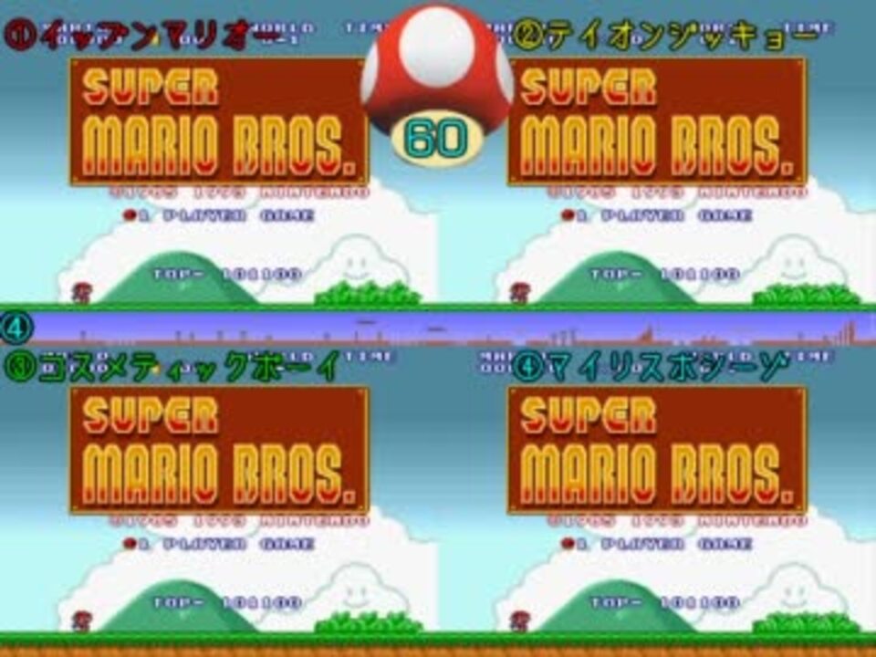 <i><font size="+2">第一回 NRAルイージ脊髄損傷杯</font></i><br />本日出場マリオと、そのオッズは以下のようになっております。<br /><br />1枠 イップンマリオー ○ 26.6<br />2枠 テイオンジッキョー △ 44.5<br />3枠 コスメティックボーイ ☆ 152.0<br />4枠 マイリスホシーゾ ◎ 5.3<br /><br /><br />1分マイリスト⇒<a href="https://www.nicovideo.jp/mylist/28630498" target="_blank" rel="noopener">mylist/28630498</a> 前⇒<a href="https://www.nicovideo.jp/watch/sm16371491" class="watch">sm16371491</a> 次⇒<a href="https://www.nicovideo.jp/watch/sm16388165" class="watch">sm16388165</a><br />コミュページから飛んだ場合コメントできないのでこちらへ⇒<a href="https://www.nicovideo.jp/watch/sm16379130" class="watch">sm16379130</a><br /><br />その他シリーズ⇒<a href="https://www.nicovideo.jp/mylist/17781719" target="_blank" rel="noopener">mylist/17781719</a> 更新報告⇒<a href="https://www.nicovideo.jp/mylist/16541121" target="_blank" rel="noopener">mylist/16541121</a><br />ブログ⇒<a href="http://ameblo.jp/akeasa/" target="_blank" rel="noopener nofollow">http://ameblo.jp/akeasa/</a><br />ツイッター⇒<a href="http://twitter.com/kada_teion" target="_blank" rel="noopener nofollow">http://twitter.com/kada_teion</a>