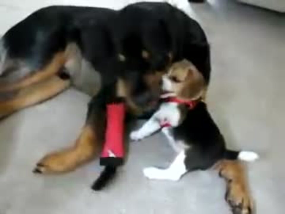 大型犬(ロットワイラー)に戦いを挑む子ビーグル 2:55