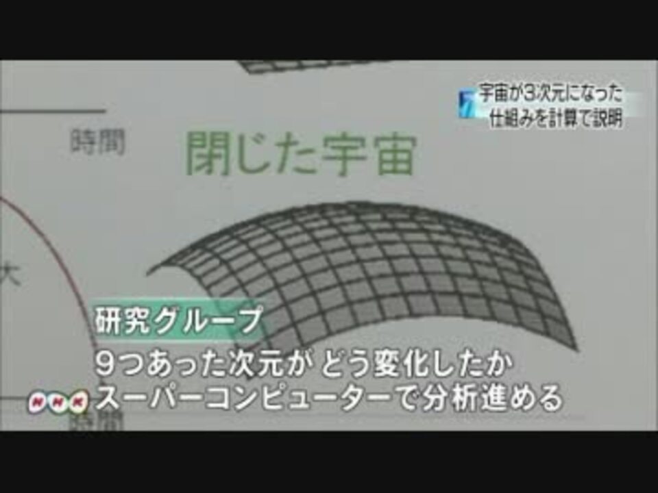 私たちの宇宙の姿は「タテ・ヨコ・高さ」の3つの次元から出来ていますが、現代物理学の理論では、137億年前にビッグバンによって宇宙が誕生する前の極めて微小な空間には、ほかに6つの次元があったとされ、なぜ3つの次元になったのかが謎になっています。茨城県つくば市にある高エネルギー加速器研究機構などのグループは、ビックバンが起きる前に、9つあった次元がどのように変化したのか調べるため、独自の計算式によって、ことし2月から京都大学にあるスーパーコンピューターで分析を進めてきました。その結果、9つの次元のうち、「タテ・ヨコ・高さ」の3つだけが急速に膨張して、残りの6つの次元は膨張せずに小さいままとどまったことを・・・