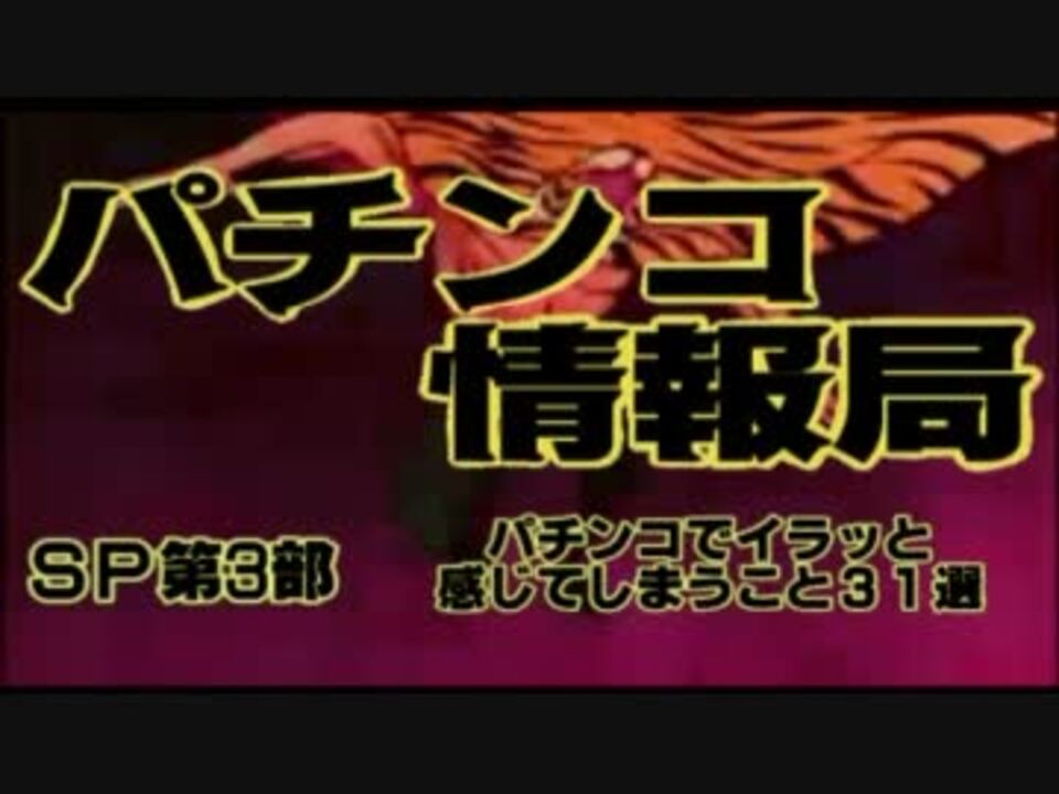 <この動画について><br />この動画はパチンコに関する様々な情報をお伝えする動画になっています。<br />素人が作成した動画に付き、分かりにくい部分があるかも知れません。<br /><br /><今回の内容><br />第3部ではパチンコをしているときにふとイラッとすることを、<br />客、ホール、演出面から考えてみました。共感できる物はあるでしょうか?<br /><br /><その他><br />パチンコの情報共有のためのコミュを開設しています。<br />登録いたしますと、動画投稿時にニコレポにてお知らせします。<br />興味のある方はぜひ。 → co1126550<br />パチンコ情報局まとめ → <a href="https://www.nicovideo.jp/mylist/25055963" target="_blank" rel="noopener">mylist/25055963</a><br /> <br /><お知らせ><br />年始特別企画として第2部と第3部を用意しました。よろしければご覧くださいな。<br />本編→<a href="https://www.nicovideo.jp/watch/sm16585386" class="watch">sm16585386</a><br />第2部→<a href="https://www.nicovideo.jp/watch/sm16586360" class="watch">sm16586360</a>