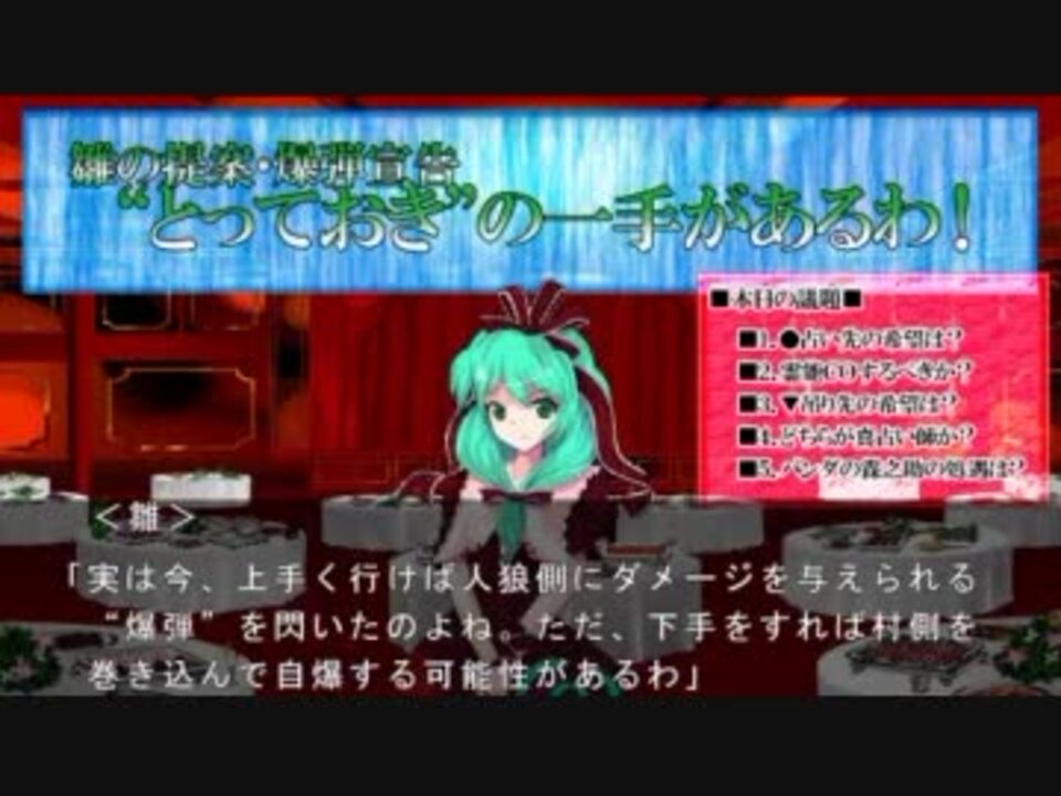 本動画は“汝は人狼なりや”という遊びを題材とした「東方人狼劇」の三次創作となります。<br /><u>注意事項につきましてはpart1と同様のため、そちらの方をご覧下さい。</u><br /><br />☆今回の見所は、雛の<b><font size=3 color=red><u>超新星・姉御ビックバン</u>です。</font></b><br /> 皆を巻き込みどこまでも大回転する雛と、違う意味で大暴走する霖之助。<br /> 二人の恋の行方は―――って、どう見ても片想いでしょう。<br /><br />part0:<a href="https://www.nicovideo.jp/watch/sm16473531" class="watch">sm16473531</a><br />≪1日目スキマ:<a href="https://www.nicovideo.jp/watch/sm16603814" class="watch">sm16603814</a> ★前:<a href="https://www.nicovideo.jp/watch/sm16564296" class="watch">sm16564296</a>┃<a href="https://www.nicovideo.jp/mylist/27266386" target="_blank" rel="noopener">mylist/27266386</a>┃★次:<a href="https://www.nicovideo.jp/watch/sm16854211" class="watch">sm16854211</a> ★2日目スキマ:<a href="https://www.nicovideo.jp/watch/sm16767007" class="watch">sm16767007</a>≫<br />■コミュニティ⇒co1316775
