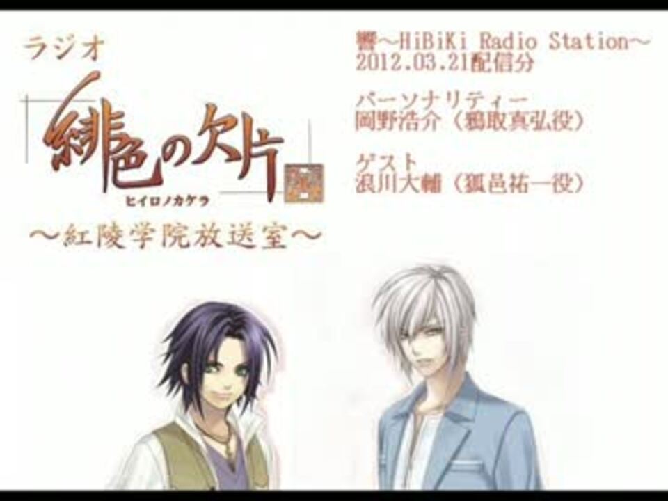 「緋色の欠片」TVアニメ2012年4月スタート <a href="http://www.hiironokakera.tv/" target="_blank" rel="noopener nofollow">http://www.hiironokakera.tv/</a><br /><br />公式Twitter <a href="https://twitter.com/#!/hiiro_anime" target="_blank" rel="noopener nofollow">https://twitter.com/#!/hiiro_anime</a><br /><br />響 - HiBiKi Radio Station <a href="http://hibiki-radio.jp/description/hiiro" target="_blank" rel="noopener nofollow">http://hibiki-radio.jp/description/hiiro</a><br />Lantis <a href="http://lantis-net.com/hiiro/" target="_blank" rel="noopener nofollow">http://lantis-net.com/hiiro/</a><br /><br />MC:岡野浩介(鴉取真弘役)<br />ゲスト:浪川大輔(狐邑祐一役)<br /><br />マイリスト:<a href="https://www.nicovideo.jp/mylist/30231151" target="_blank" rel="noopener">mylist/30231151</a><br /><br /><font color="red">BD&DVD第一巻 2012年6月22日(金)発売決定!</font><br /><br />待望の<font color="red">『緋色の欠片』単独イベント</font>の開催がついに決定!<br />また、アニメイトカフェ・パセラとのコラボ決定!