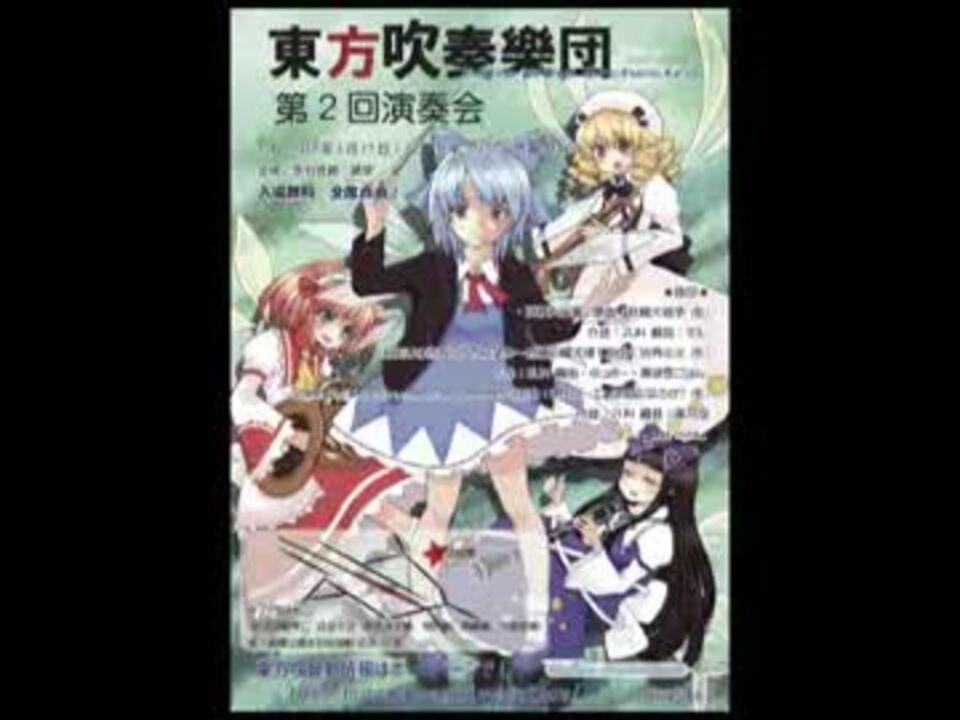 2012年3月17日に行われた、東方吹奏楽団の第2回演奏会の録音です(こちらは第一部のみ)。<br /><br />【お知らせ】演奏会録音MP3を公開中です => <a href="http://xfs.jp/xtwkP" target="_blank" rel="noopener nofollow">http://xfs.jp/xtwkP</a><br />【お知らせ】管楽器専門誌「poco a poco」に演奏の様子が掲載されました!下記URLからDL可能です。2012年4月号の9ページをご覧下さい。写真もあるよ☆ <a href="http://poco.otonoki.jp/archives/category/webmagazine" target="_blank" rel="noopener nofollow">http://poco.otonoki.jp/archives/category/webmagazine</a><br /><br />第二部の演奏は<a href="https://www.nicovideo.jp/watch/sm17504043" class="watch">sm17504043</a>にて!<br />高画質・高音質版は <a href="http://youtu.be/oyll44ZnLKI" target="_blank" rel="noopener nofollow">http://youtu.be/oyll44ZnLKI</a> にてご覧いただけます。<br /><br />--<br />東方吹奏樂団で演奏してみたリスト:<br /><a href="https://www.nicovideo.jp/mylist/33266646" target="_blank" rel="noopener">mylist/33266646</a><br /><br />ご見学・ご入団、その他ご連絡お待ちしております。<br />【東方吹奏樂団(関東本部)】<br /><a href="http://touhousuisougaku.web.fc2.com/" target="_blank" rel="noopener nofollow">http://touhousuisougaku.web.fc2.com/</a>
