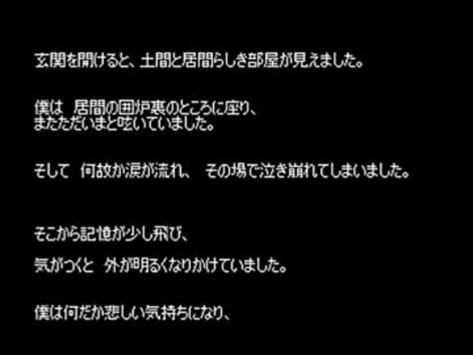 1話目:<a href="#" class="seekTime" data-seekTime="00:00" onclick="seekNicoPlayer('#00:00'); return false;">#00:00</a> 消えた野球ボール(匿名さん) <br />2話目:<a href="#" class="seekTime" data-seekTime="02:29" onclick="seekNicoPlayer('#02:29'); return false;">#02:29</a> ロングヘアー(匿名.comさん) <br />3話目:<a href="#" class="seekTime" data-seekTime="03:53" onclick="seekNicoPlayer('#03:53'); return false;">#03:53</a> 1572年の鏡(Kさん)※グロ注意 <br />4話目:<a href="#" class="seekTime" data-seekTime="11:04" onclick="seekNicoPlayer('#11:04'); return false;">#11:04</a> 廃墟(じゅるるさん) <br /><br />我が家のゆっくりが、ホラーテラーを読んでくれました。<br />人によっては残酷と感じる表現が含まれる場合があります。<br /><br />お気に召されないお話があった場合は、飛ばしてご視聴下さい。<br /><br />作業用としてループで聞きたいとのご要望をいただきまして<br />自動で次の動画に移動するように設定してあります。<br />(最新の動画のみ、最初の動画に移動します。)<br /><br />ループが嫌な方は、お手数なのですが、終わり際で停止ボタンを<br />押すようにして下さい。<br /><br />バックナンバー>><a href="https://www.nicovideo.jp/mylist/31377965" target="_blank" rel="noopener">mylist/31377965</a><br />有名な話のあらすじ>><a href="https://www.nicovideo.jp/watch/sm17570303" class="watch">sm17570303</a>
