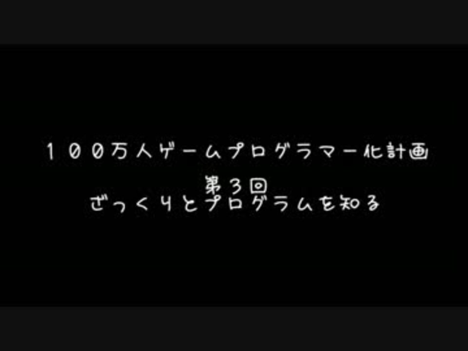 <font size="5" color="red">100万人ゲームプログラマー化計画</font><br />【第3回】 ざっくりとプログラムを知る<br /><br />ゲームプログラマー、プログラマーになりたい人のためにプログラミング講座をやってます。<br />ニコニコ生放送をキャプチャーしているため、プツプツ途切れたりする場合がありますがご了承ください。<br /><br />co138224 ←コチラで放送しています。<br /><br /><a href="https://www.nicovideo.jp/mylist/32009415" target="_blank" rel="noopener">mylist/32009415</a> ←マイリスト<br /><br />OS:Windows<br />言語:C#<br /><br />前<a href="https://www.nicovideo.jp/watch/sm17820143" class="watch">sm17820143</a> 次<a href="https://www.nicovideo.jp/watch/sm17823424" class="watch">sm17823424</a><br />