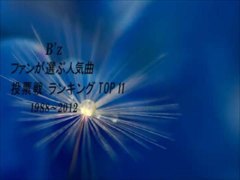 2か月にわたり、開催しましたB'z人気曲投票選挙、集計を発表します。約560票もの投票ありがとうございました。ここに総304曲の中からのファンが選ぶ2012年最新B'zランキングが完成、上位11位から1位をランキングしました。動画最後に惜しくもランク入りを逃した12位も紹介。一部曲名や数字入力ミス。GLAY人気曲投票選挙⇒<a href="https://www.nicovideo.jp/watch/sm18313055" class="watch">sm18313055</a> B'zテンション上げ×↑SUPER ROCKメドレー200分⇒<a href="https://www.nicovideo.jp/watch/sm15668330" class="watch">sm15668330</a> B'z VS B'z 熱き16番対決シリーズ⇒<a href="https://www.nicovideo.jp/watch/sm15144865" class="watch">sm15144865</a> その他⇒<a href="https://www.nicovideo.jp/mylist/14373184" target="_blank" rel="noopener">mylist/14373184</a> ⇒25周年B'zファンみんなで選ぶ神曲シングル総選挙TOP38⇒<a href="https://www.nicovideo.jp/watch/sm19988075" class="watch">sm19988075</a> 25周年B'zバラード総選挙TOP25⇒<a href="https://www.nicovideo.jp/watch/sm20410248" class="watch">sm20410248</a>
