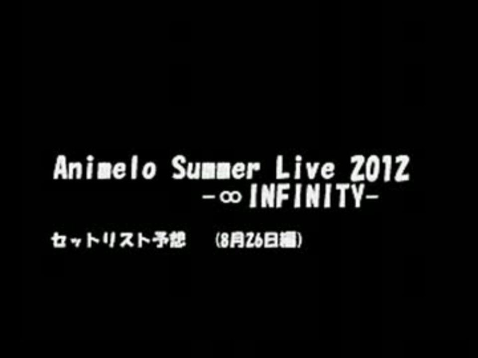 今年もやりますセトリ予想!<br />Animelo Summer Live 2012 -∞INFINITY-に向けてのセットリスト予想になります。アーティストや楽曲の予想や、皆さんの予想を語る場としてどうぞ。<br />こちらは8月26日(日)分の前編となります。<br />今年から両日を前編・後編に分けて合計4つの動画にしましたので宜しくお願いします。<br /><br />-補足-<br />※1:あくまで個人的な予想であり、実際のセットリストとは大きく異なる可能性があります。<br />※2:タイアップに関してはアニメ・ゲーム・特撮関連以外は「一般タイアップ」または「ノータイアップ」として扱っています。<br /><br /><br /><br />25日・前編⇒<a href="https://www.nicovideo.jp/watch/sm18575180" class="watch">sm18575180</a> / 25日・後編⇒<a href="https://www.nicovideo.jp/watch/sm18575224" class="watch">sm18575224</a><br />26日・後編⇒<a href="https://www.nicovideo.jp/watch/sm18602680" class="watch">sm18602680</a><br /> 【昨年の予想】 ⇒ <a href="https://www.nicovideo.jp/mylist/26536810" target="_blank" rel="noopener">mylist/26536810</a>