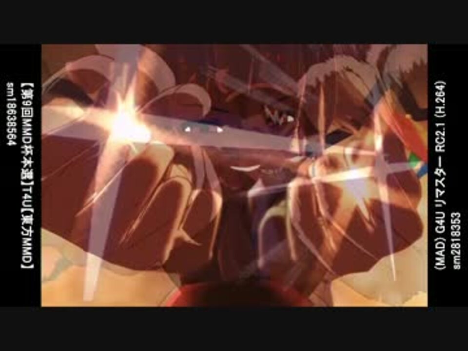 T4U × G4Uを重ねてみたらすごいことになってました。<br />・【第9回MMD杯本選】T4U【東方MMD】(<a href="https://www.nicovideo.jp/watch/sm18638564" class="watch">sm18638564</a>)<br />・(MAD) G4U リマスター RC2.1 (H.264)(<a href="https://www.nicovideo.jp/watch/sm2818353" class="watch">sm2818353</a>)<br /><br />各比較<br />・ジェバンニの3動画比較→≪比較≫【MMD】G4U×T4U+α【GR MAD】(<a href="https://www.nicovideo.jp/watch/sm18644764" class="watch">sm18644764</a>)<br />・T4U×G4Uの2動画比較→【比較】T4U × G4U【東方MMD×GRMAD】(<a href="https://www.nicovideo.jp/watch/sm18648922" class="watch">sm18648922</a>)<br />・T4U×ミク版G4Uの2動画比較→ミク版G4UとT4Uを比較してみた(<a href="https://www.nicovideo.jp/watch/sm18653115" class="watch">sm18653115</a>)<br /><br /><追記><br />ぺんぎんさん、スパさん、動画でのご紹介ありがとうございます。恐縮ですm(__)m<br /><br />T4Uの『テーマ「⑨」:竹 三次創作賞』受賞おめでとうございます。<br />