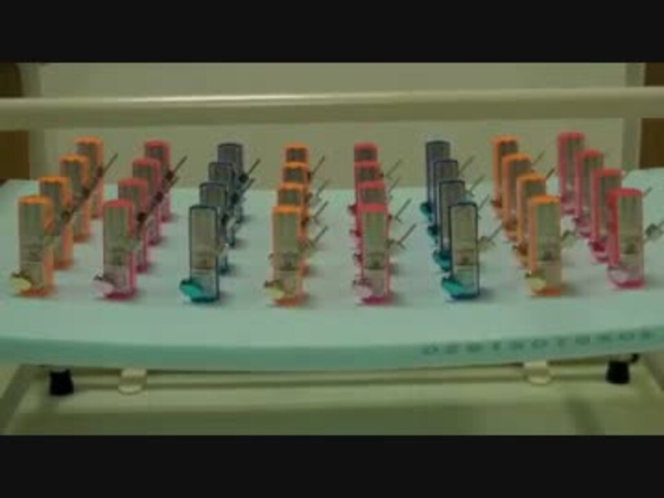 複数のメトロノームを動く台の上に乗せてメトロノームを動かすと,やがて全てのメトロノームが同期して同じタイミングで音を刻むことが知られています.池口研究室では,メトロノームを乗せる台を左右から吊るすことで台が動くような実験装置を作成し,同期実験を行いました.本動画では32個のメトロノームが同じタイミングで音を刻みます.池口研究室マイリスト→<a href="https://www.nicovideo.jp/mylist/25328618" target="_blank" rel="noopener">mylist/25328618</a>