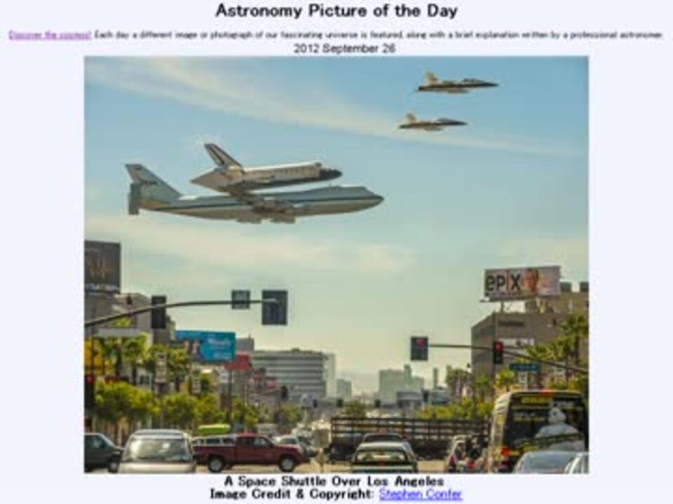 9月26日 Astronomy Picture of the Day - A Space Shuttle Over Los Angeles 「ロサンゼルスを飛ぶスペースシャトル」です。APODとはNASAが直近の天文現象に関する写真を、天文学者の説明を添えて毎日1枚公開しているサイトです。英語の勉強に読んでます。間違いがあれば指摘いただけると嬉しいです。美しい写真と原文:<a href="http://apod.nasa.gov/apod/ap120926.html" target="_blank" rel="noopener nofollow">http://apod.nasa.gov/apod/ap120926.html</a> お借りした音源様:1267623649 APODreadingマイリスト <a href="https://www.nicovideo.jp/mylist/34471936" target="_blank" rel="noopener">mylist/34471936</a>(2012年9月) (<a href="https://www.nicovideo.jp/watch/sm18981511" class="watch">sm18981511</a><前日 翌日><a href="https://www.nicovideo.jp/watch/sm18996576" class="watch">sm18996576</a>)