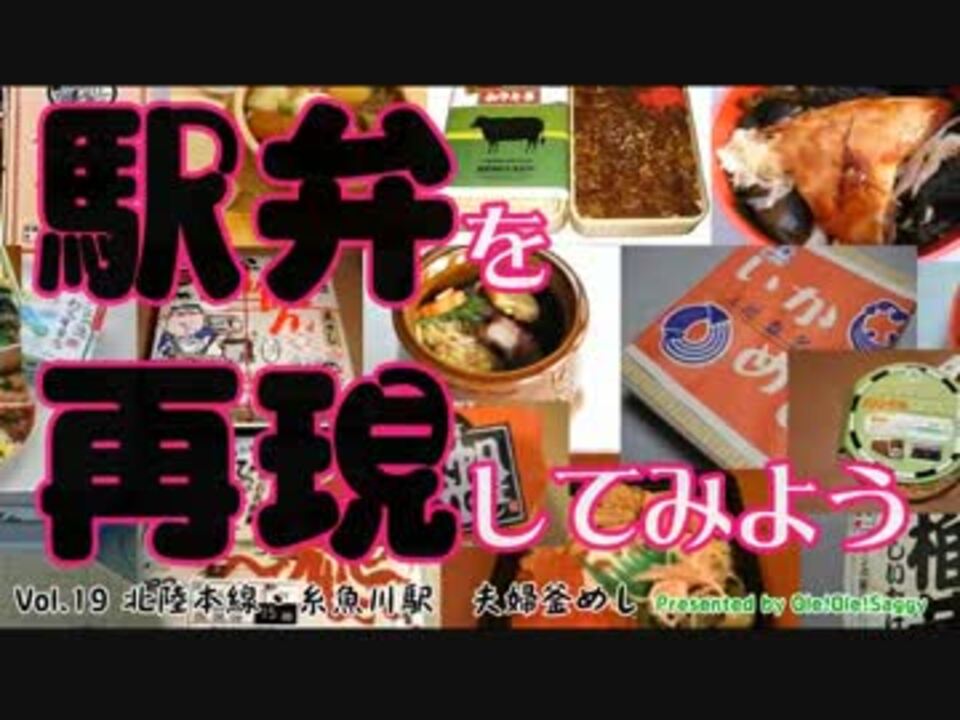 今回再現するのは、糸魚川駅名物の釜飯・ザ・ベストセレクションな逸品です。<br />夫の釜飯は松茸メイン、妻の釜飯はホタテメイン。・・・・余計なことを考えた君!廊下に立ってなさい!<br /><br />今回は、仕様変更のテストをしてみました。ちょっと調理音入れてます。<br /><br />前:いわし駅弁3種→<a href="https://www.nicovideo.jp/watch/sm19061705" class="watch">sm19061705</a> 後:稚内駅・最北駅弁ほたて→<a href="https://www.nicovideo.jp/watch/sm19260508" class="watch">sm19260508</a><br />大糸線へ→<a href="https://www.nicovideo.jp/watch/sm16174204" class="watch">sm16174204</a> だしカレー丼→<a href="https://www.nicovideo.jp/watch/sm17819822" class="watch">sm17819822</a><br />車載動画・旅行記・料理→<a href="https://www.nicovideo.jp/mylist/18096776" target="_blank" rel="noopener">mylist/18096776</a> 鉄道前面展望・最新→<a href="https://www.nicovideo.jp/mylist/6587395" target="_blank" rel="noopener">mylist/6587395</a> 総合駅→<a href="https://www.nicovideo.jp/user/5903512" target="_blank" rel="noopener">user/5903512</a><br /><br />北海道~九州・普通列車の旅・展開中!→<a href="https://www.nicovideo.jp/watch/sm17047310" class="watch">sm17047310</a>(稚内)から
