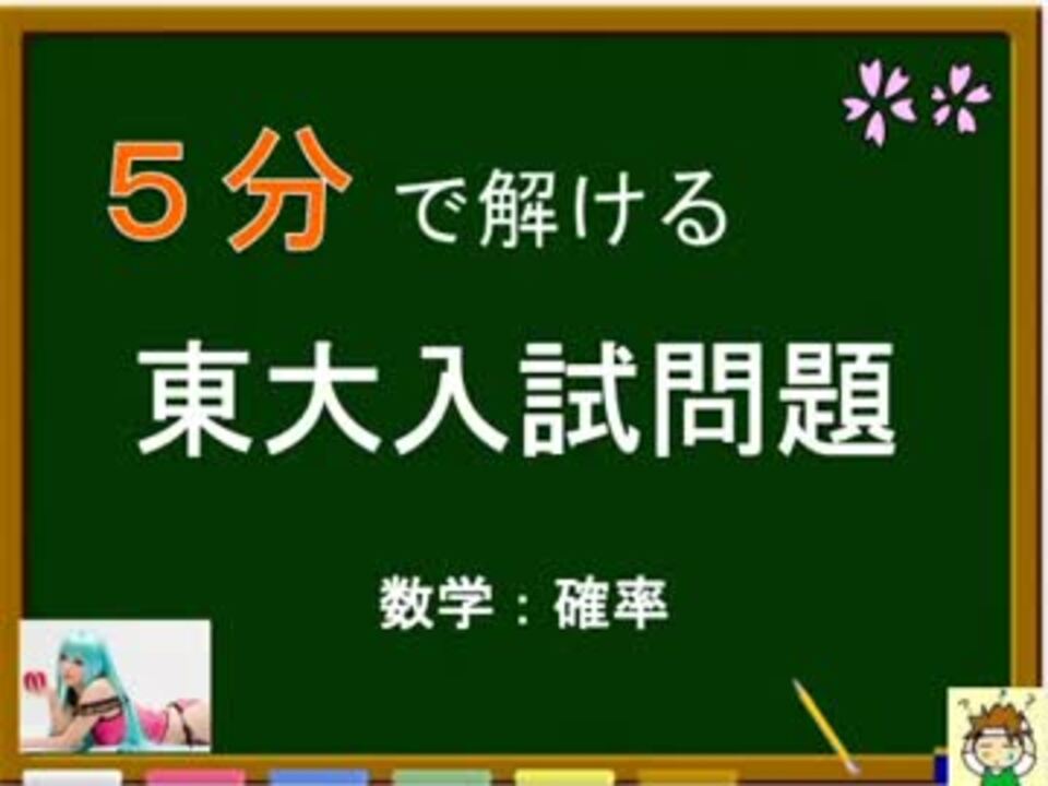 東大の入試問題をたったの5分で解説!<br />今回は数学の確率問題!<br /><br /><font color="red"><b>(2)も解説しました! → <a href="https://seiga.nicovideo.jp/watch/mg44514" target="_blank" rel="noopener">mg44514</a><br /></b></font><br />【使用BGM】<br />いーあるふぁんくらぶ<br />Rainbow Girl(レインボーガール)<br /><br />東大こみゅ → co626839<br />↑東大生がニコ生で勉強をおしえるよ!<br /><br />昔作った松岡修造ver. → <a href="https://www.nicovideo.jp/watch/sm8003559" class="watch">sm8003559</a><br /><br />高校すうがく動画! → <a href="https://www.nicovideo.jp/mylist/34246743" target="_blank" rel="noopener">mylist/34246743</a><br />どきゅめんたりー動画! → <a href="https://www.nicovideo.jp/mylist/34282561" target="_blank" rel="noopener">mylist/34282561</a><br />