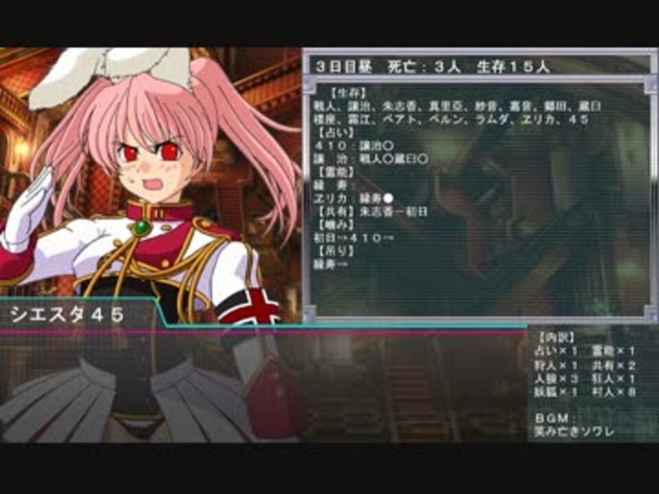 ハッピーハロウィン!<br /><br />Nスクが画面サイズを自由にできるようになったので動画をプチリニューアル。<br />久々の投稿なので、肩慣らしという事で全然普通な村のリプレイになってます。<br /><br />元村ログ→<a href="http://jinrou.dip.jp/~jinrou/kako/101726.html" target="_blank" rel="noopener nofollow">http://jinrou.dip.jp/~jinrou/kako/101726.html</a><br />vol.12→<a href="https://www.nicovideo.jp/watch/sm16330773" class="watch">sm16330773</a> vo.14→<a href="https://www.nicovideo.jp/watch/sm20139718" class="watch">sm20139718</a> リプレイシリーズマイリスト→<a href="https://www.nicovideo.jp/mylist/18956606" target="_blank" rel="noopener">mylist/18956606</a><br />ブログ→<a href="http://nyorororon.blog57.fc2.com/" target="_blank" rel="noopener nofollow">http://nyorororon.blog57.fc2.com/</a>