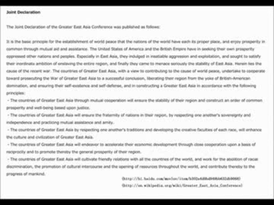 「大東亜戦争においてわれわれの希求するものは勝利であり、大東亜共栄圏についていえば共栄である。大東亜各国はそれぞれ自らの国を愛し、その隣国を愛し、ともに東亜をあいすべきである。中国のモットーは中国の復興、東亜の防衛であり、これは中国が自主独立を獲得した時、初めて東亜防衛の責任を分担する能力が生じ、同時に東亜防衛を獲得して、初めて中国の自主独立が保障されるのである。」<br />汪兆銘 主席<br />(<a href="http://www5f.biglobe.ne.jp/~thai/page006.html)" target="_blank" rel="noopener nofollow">http://www5f.biglobe.ne.jp/~thai/page006.html)</a><br /><br />字が小さすぎて読めないと思うので、コメント欄にも書きます。<br />(<a href="http://en.wikisource.org/wiki/Joint_Declaration_of_the_Greater_East_Asia_Conference)" target="_blank" rel="noopener nofollow">http://en.wikisource.org/wiki/Joint_Declaration_of_the_Greater_East_Asia_Conference)</a><br />(<a href="http://hi.baidu.com/muvluv/item/b302a4d0bd949bb632db9068)" target="_blank" rel="noopener nofollow">http://hi.baidu.com/muvluv/item/b302a4d0bd949bb632db9068)</a>