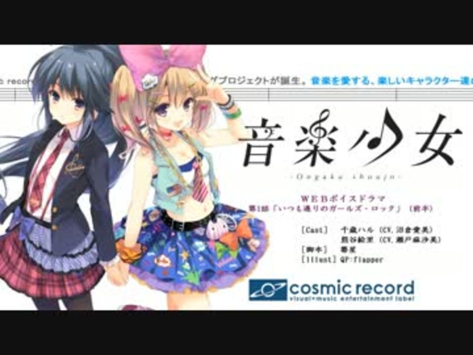 声優さんの表現力と本格アーティスト楽曲のコラボレーション<br />「音楽少女」プロジェクト・ボイスドラマ<br /><br />第1話「いつも通りのガールズ・ロック」(前半)<br /><br />出演<br />千歳ハル (cv.沼倉愛美)<br />熊谷絵里 (cv.瀬戸麻沙美)<br /><br />脚本 箒星<br />イラスト QP:flapper<br /><br /> [WEBサイト] <a href="http://cosmic.surpara.com/music_girls.html" target="_blank" rel="noopener nofollow">http://cosmic.surpara.com/music_girls.html</a><br /> [twitter](更新情報) <a href="https://twitter.com/cosmic_rec" target="_blank" rel="noopener nofollow">https://twitter.com/cosmic_rec</a><br /> コミックマーケット83出展決定!<br /><br /> 第1話後編 <a href="http://www.nicovideo.jp/watch/sm19444294" target="_blank" rel="noopener nofollow">http://www.nicovideo.jp/watch/sm19444294</a><br />