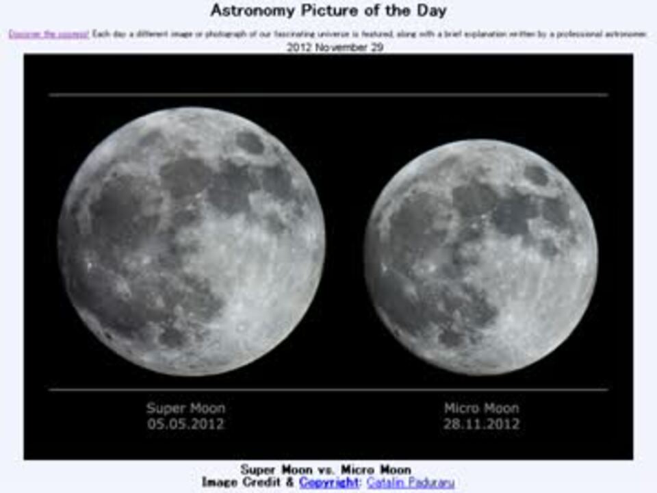 11月29日 Astronomy Picture of the Day - Super Moon vs. Micro Moon 「スーパームーン対ミクロムーン」です。APODとはNASAが直近の天文現象に関する写真を、天文学者の説明を添えて毎日1枚公開しているサイトです。英語の勉強に読んでます。間違いがあれば指摘いただけると嬉しいです。美しい写真と原文:<a href="http://apod.nasa.gov/apod/ap121129.html" target="_blank" rel="noopener nofollow">http://apod.nasa.gov/apod/ap121129.html</a> お借りした音源様:<a href="https://www.nicovideo.jp/watch/sm15271486" class="watch">sm15271486</a> APODreadingマイリスト <a href="https://www.nicovideo.jp/mylist/34891143" target="_blank" rel="noopener">mylist/34891143</a>(2012年11月) (<a href="https://www.nicovideo.jp/watch/sm19467547" class="watch">sm19467547</a><前日 翌日><a href="https://www.nicovideo.jp/watch/sm19484771" class="watch">sm19484771</a>)