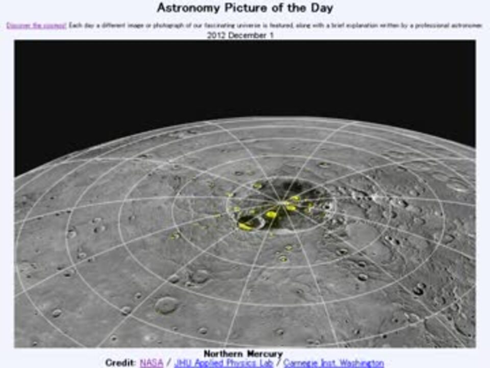 12月1日 Astronomy Picture of the Day - Northern Mercury 「水星の北部」です。APODとはNASAが直近の天文現象に関する写真を、天文学者の説明を添えて毎日1枚公開しているサイトです。英語の勉強に読んでます。間違いがあれば指摘いただけると嬉しいです。美しい写真と原文:<a href="http://apod.nasa.gov/apod/ap121201.html" target="_blank" rel="noopener nofollow">http://apod.nasa.gov/apod/ap121201.html</a> お借りした音源様:<a href="https://www.nicovideo.jp/watch/sm15979942" class="watch">sm15979942</a> APODreading <a href="https://www.nicovideo.jp/mylist/36151579" target="_blank" rel="noopener">mylist/36151579</a> (2012年12月分) (<a href="https://www.nicovideo.jp/watch/sm19484771" class="watch">sm19484771</a><前日 翌日><a href="https://www.nicovideo.jp/watch/sm19499638" class="watch">sm19499638</a>)