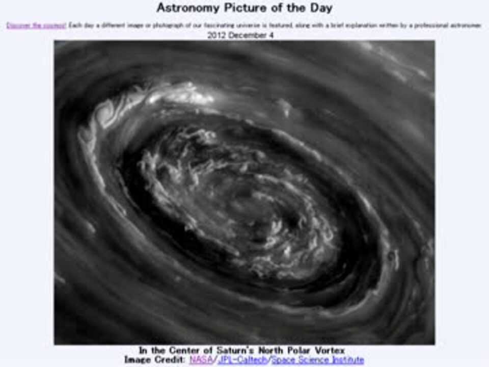 12月4日 Astronomy Picture of the Day - In the Center of Saturn's North Polar Vortex 「土星北極の極渦中心」です。APODとはNASAが直近の天文現象に関する写真を、天文学者の説明を添えて毎日1枚公開しているサイトです。英語の勉強に読んでます。間違いがあれば指摘いただけると嬉しいです。美しい写真と原文:<a href="http://apod.nasa.gov/apod/ap121204.html" target="_blank" rel="noopener nofollow">http://apod.nasa.gov/apod/ap121204.html</a> お借りした音源様:<a href="https://www.nicovideo.jp/watch/sm15847092" class="watch">sm15847092</a> APODreadingマイリスト <a href="https://www.nicovideo.jp/mylist/36151579" target="_blank" rel="noopener">mylist/36151579</a> (2012年12月分) (<a href="https://www.nicovideo.jp/watch/sm19507332" class="watch">sm19507332</a><前日 翌日><a href="https://www.nicovideo.jp/watch/sm19520692" class="watch">sm19520692</a>)