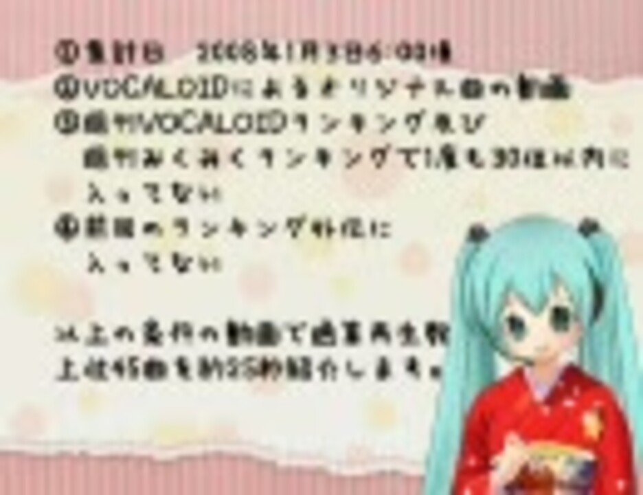 プレイリスト <a href="https://www.nicovideo.jp/mylist/30702962" target="_blank" rel="noopener">mylist/30702962</a><br />1.08/1/3 6:00頃の資料。07/12/30以前の投稿(週刊#1~#13の対象期間) 2.VOCALOIDによるオリジナル曲 3.週刊VOCALOIDランキング及び、みくみくランキングで一度も30位以内に入ってない。4.前回の外伝<a href="https://www.nicovideo.jp/watch/sm1720100" class="watch">sm1720100</a>に入ってない 以上の条件を満たす曲を通算再生数上位45曲<br />ボカラン観測所様の1/3付の資料を使わせて頂きました。前回調査を断念したミク以外のVOCALOIDのオリジナル曲も対象とする事が出来ました。感謝です。伴い、名称変更しました。<br />ランクイン調査は週刊VOCALOIDランキングまとめ様を参考にさせて頂きました。こちらも感謝です。<br />■4位おさとうノエルは#10 24位にランクインしてました。<br />次<a href="https://www.nicovideo.jp/watch/sm2167313" class="watch">sm2167313</a> 前<a href="https://www.nicovideo.jp/watch/sm1720100" class="watch">sm1720100</a> SE10 <a href="https://www.nicovideo.jp/watch/sm9816280" class="watch">sm9816280</a> DX <a href="https://www.nicovideo.jp/watch/sm4660187" class="watch">sm4660187</a> 他の外伝<a href="https://www.nicovideo.jp/mylist/6010156" target="_blank" rel="noopener">mylist/6010156</a> 他の外伝SE <a href="https://www.nicovideo.jp/mylist/6010160" target="_blank" rel="noopener">mylist/6010160</a>