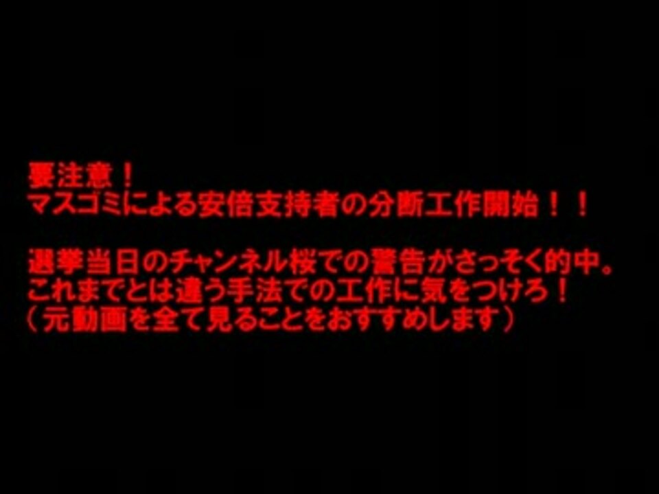浮かれるのはまだ早い。すでに戦いは始まっているようです。これからの新しい工作活動に要注意。チャンネル桜【アーカイブ】VOTE2012 「ネット生放送」選挙特番[桜H24/12/17] ①<a href="https://www.nicovideo.jp/watch/1355716265" class="watch">watch/1355716265</a> ②<a href="https://www.nicovideo.jp/watch/1355718253" class="watch">watch/1355718253</a> ③<a href="https://www.nicovideo.jp/watch/1355720340" class="watch">watch/1355720340</a> ④<a href="https://www.nicovideo.jp/watch/1355717804" class="watch">watch/1355717804</a>