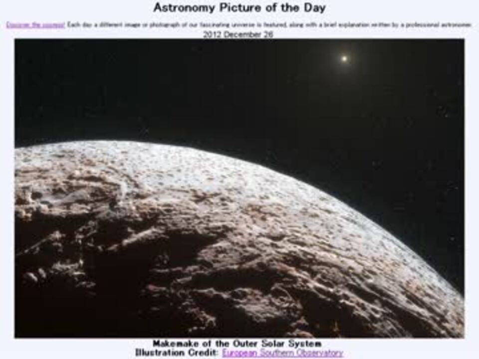 12月26日 Astronomy Picture of the Day - Makemake of the Outer Solar System 「太陽系外縁のマケマケ」です。APODとはNASAが直近の天文現象に関する写真を、天文学者の説明を添えて毎日1枚公開しているサイトです。英語の勉強に読んでます。間違いがあれば指摘いただけると嬉しいです。美しい写真と原文:<a href="http://apod.nasa.gov/apod/ap121226.html" target="_blank" rel="noopener nofollow">http://apod.nasa.gov/apod/ap121226.html</a> お借りした音源様:<a href="https://commons.nicovideo.jp/works/nc52725" target="_blank" rel="noopener">nc52725</a> APODreadingマイリスト <a href="https://www.nicovideo.jp/mylist/36151579" target="_blank" rel="noopener">mylist/36151579</a> (2012年12月分) (<a href="https://www.nicovideo.jp/watch/sm19682731" class="watch">sm19682731</a><前日 翌日><a href="https://www.nicovideo.jp/watch/sm19696965" class="watch">sm19696965</a>)