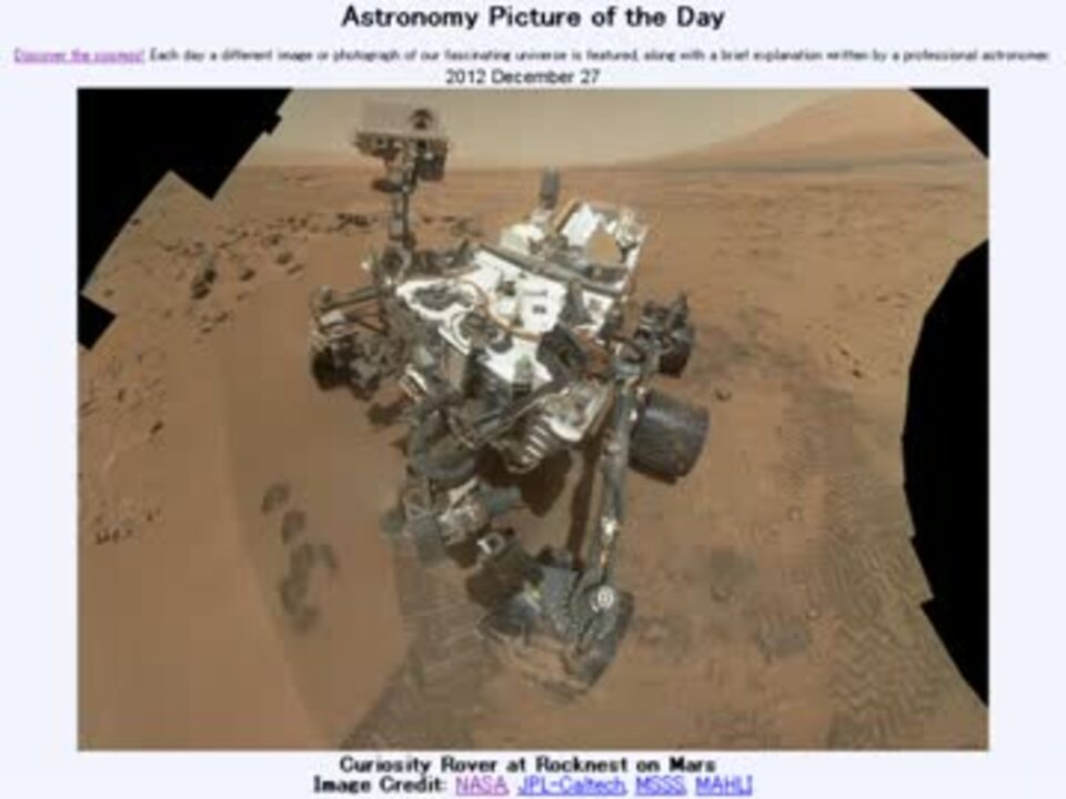 12月27日 Astronomy Picture of the Day - Curiosity Rover at Rocknest on Mars 「火星のロックネストにいるキュリオシティ」です。APODとはNASAが直近の天文現象に関する写真を、天文学者の説明を添えて毎日1枚公開しているサイトです。英語の勉強に読んでます。間違いがあれば指摘いただけると嬉しいです。美しい写真と原文:<a href="http://apod.nasa.gov/apod/ap121227.html" target="_blank" rel="noopener nofollow">http://apod.nasa.gov/apod/ap121227.html</a> お借りした音源様:<a href="https://commons.nicovideo.jp/works/nc52306" target="_blank" rel="noopener">nc52306</a> APODreadingマイリスト <a href="https://www.nicovideo.jp/mylist/36151579" target="_blank" rel="noopener">mylist/36151579</a> (2012年12月分) (<a href="https://www.nicovideo.jp/watch/sm19688832" class="watch">sm19688832</a><前日 翌日><a href="https://www.nicovideo.jp/watch/sm19704999" class="watch">sm19704999</a>)