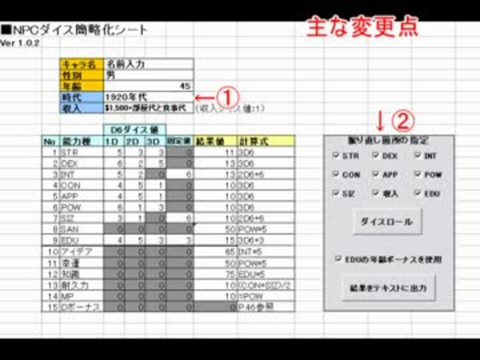 <font size="3" color="#008000"><b>この間作成したエクセルを細かくバージョンアップしました。</b></font><br /><br /><b><font color="#ff00000">■主な変更点</font></b><br />・年齢によるEDU上昇を追加(1.0.1)<br />・時代と、時代をもとにした収入を追加<br />・特定ステータスのみの振り直し対応<br /><br /><b>【DL先 Ver 1.0.2】 2014/07/08</b><br /><a href="https://www.dropbox.com/s/qd8p59v4pq8i4rg/NEC_102.zip" target="_blank" rel="noopener nofollow">https://www.dropbox.com/s/qd8p59v4pq8i4rg/NEC_102.zip</a><br /><br />レイアウト等変更しているので、旧Verが欲しい方は、<br />前の動画からどうぞ 前の動画:<a href="https://www.nicovideo.jp/watch/sm20214652" class="watch">sm20214652</a><br /><br /><font size="1">連絡先等はこちらの動画から↓</font><br /><font size="1"><a href="https://www.nicovideo.jp/watch/sm20027381" class="watch">sm20027381</a></font>