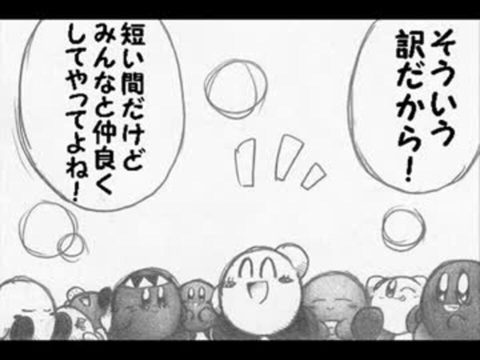 お久しぶりです、*★*です。ものすごく遅れてしまい、大変申し訳ないです--;;;10話後編ようやく出来上がりました。 ◇各々に行動し始めるいろんな色のカービィたち…シャドー君たちは果たしてカービィズを止めることができるのか!? 今回はそんな内容になっております。てかカービィたちが本気を出したらポップスターなんて簡単に滅んじゃうんでしょうね…^^;前作→<a href="https://www.nicovideo.jp/mylist/12235986" target="_blank" rel="noopener">mylist/12235986</a>今作→<a href="https://www.nicovideo.jp/mylist/29717199" target="_blank" rel="noopener">mylist/29717199</a> *追記*たくさんのかわいいコメにうっほほーい♪*´∀`*やっぱりカービィは可愛いですよね!食いしん坊だったり自分勝手だったり個性の強いカービィズですが、皆様に愛でていだたけたら嬉しいです。 クソみたいにくだらない話ができました→<a href="https://www.nicovideo.jp/watch/sm20715366" class="watch">sm20715366</a>