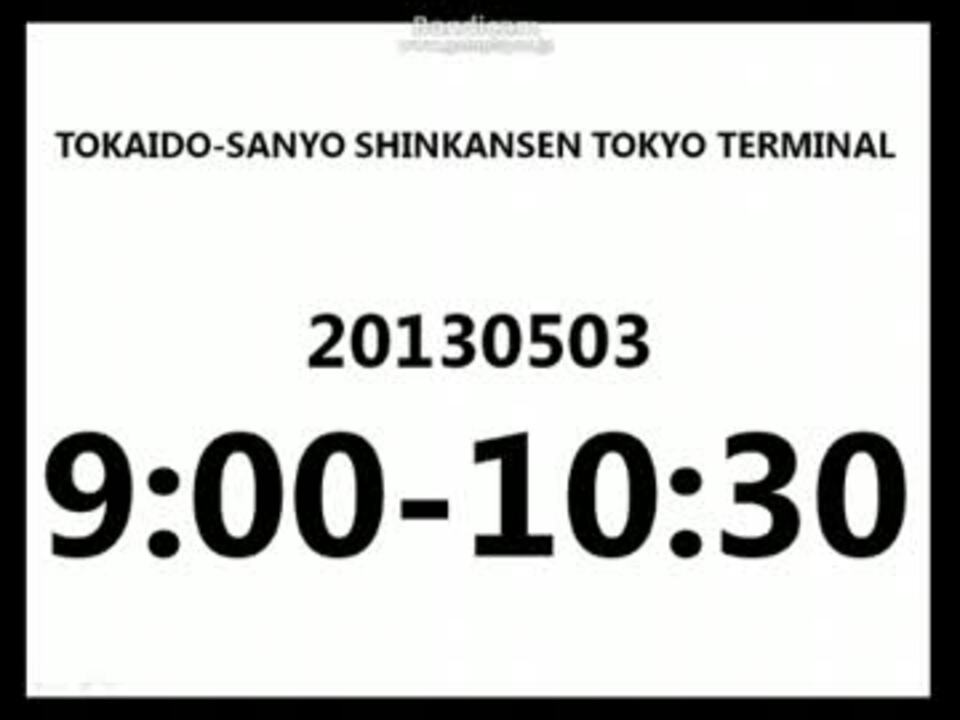 【設定日時】2013年5月3日9:00-10:30<br /><br />終着駅到着時刻を追加してみました。<br /><br />※休日運休ののぞみ号などは表示されません。ご了承ください。<br />※回送列車の発車時刻は時刻表を基に推測したものである為、間違いがあるかもしれません。その点も御了解ください。<br /><br /><br />5:30-7:30→<a href="https://www.nicovideo.jp/watch/sm20866226" class="watch">sm20866226</a> 図の見方などはこちらをご覧ください<br />7:30-9:00→<a href="https://www.nicovideo.jp/watch/sm20891028" class="watch">sm20891028</a><br />9:00-10:30→これ<br />10:30-12:00→<a href="https://www.nicovideo.jp/watch/sm22881839" class="watch">sm22881839</a><br /><br />東京駅シリーズ→<a href="https://www.nicovideo.jp/mylist/37150486" target="_blank" rel="noopener">mylist/37150486</a><br /><br /><b>2016.09.20 新作および高画質版はyoutubeにUPしています。そちらもぜひご覧ください。<br /></b><font color="red"><a href="https://www.youtube.com/watch?v=_j8PswoMbis" target="_blank" rel="noopener nofollow">https://www.youtube.com/watch?v=_j8PswoMbis</a></font><br /><br />